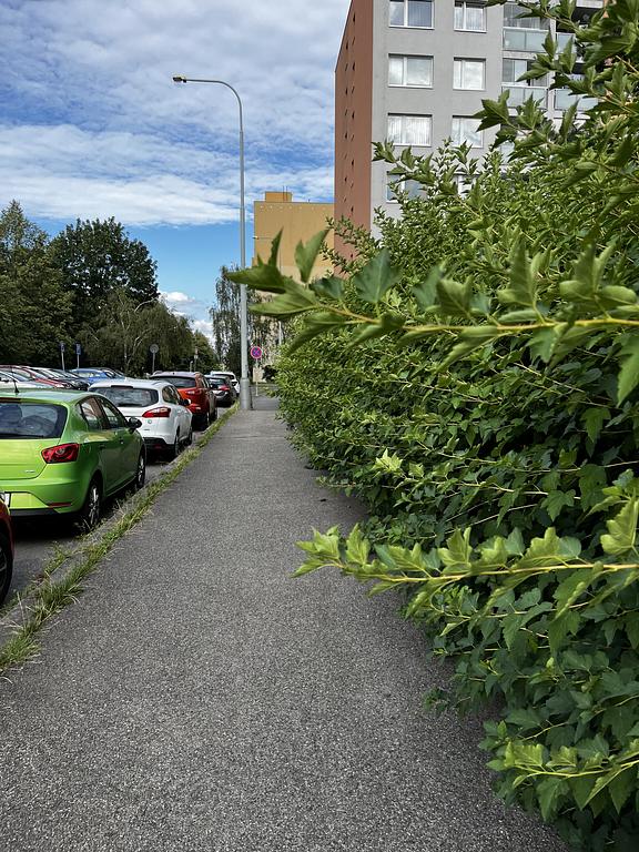 Křoví, které zasahuje místy do třetiny chodníku, jistě by si zasloužilo zkrátit