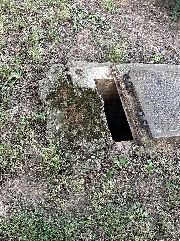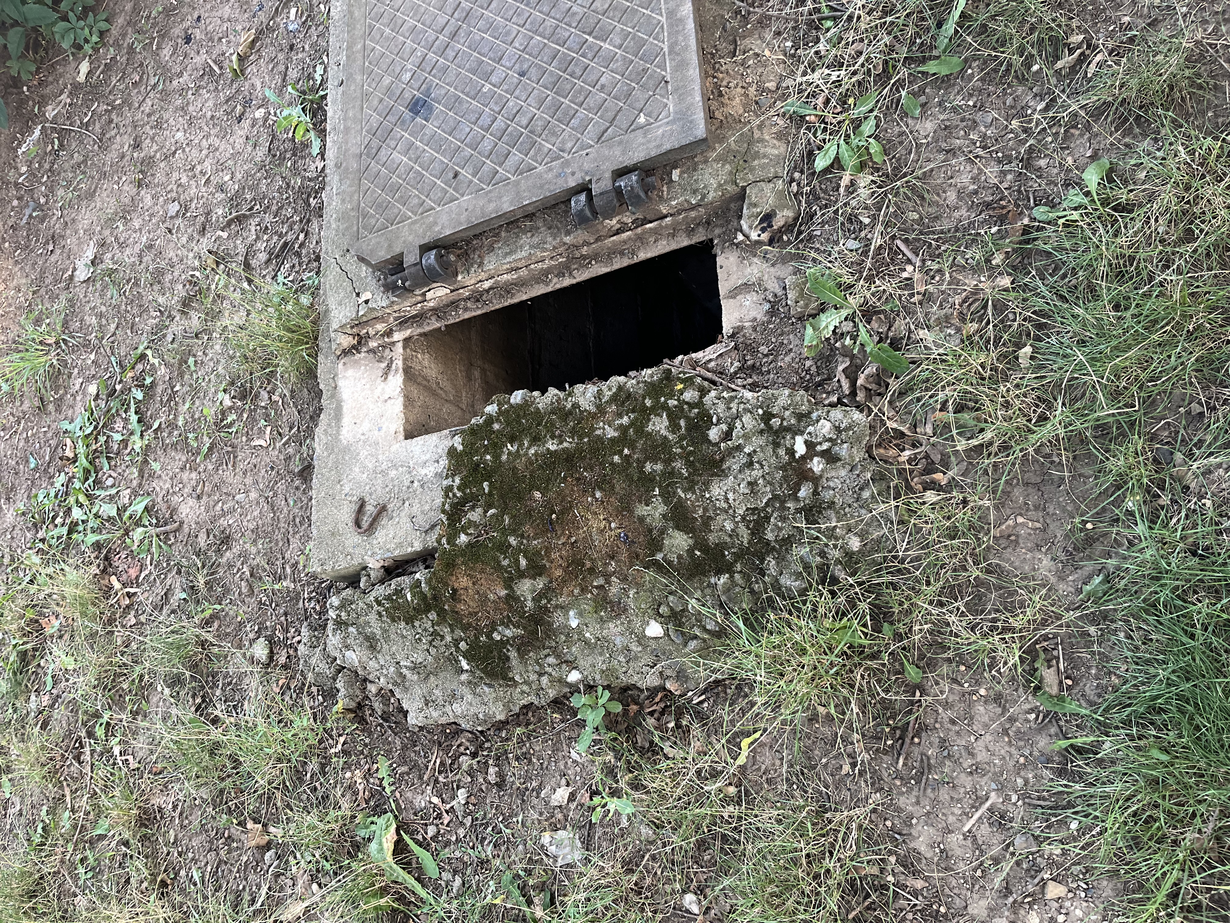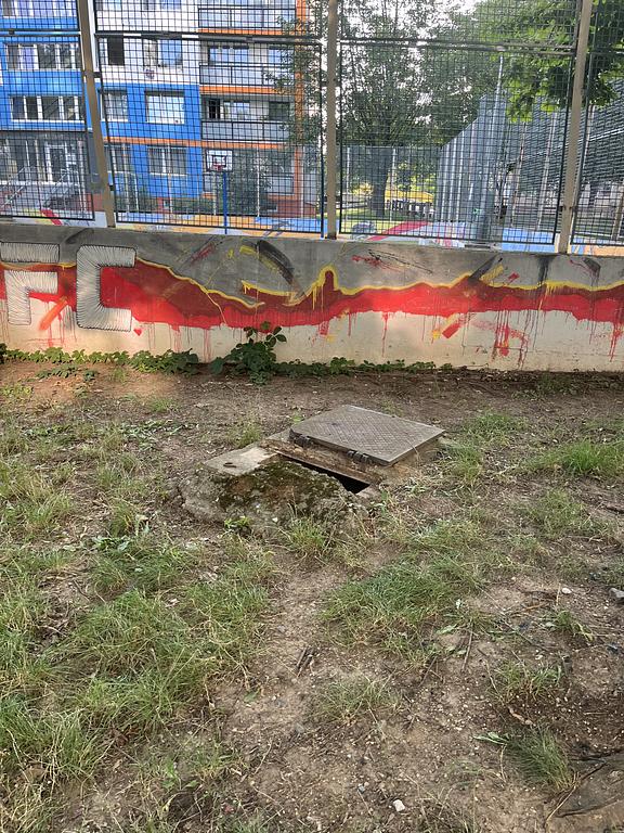 U sportovního hřiště před domem Böhmova 1976/1 chybí část poklopu na kanál/podzemní vstup. Hrozí pád dětí ci zvířat