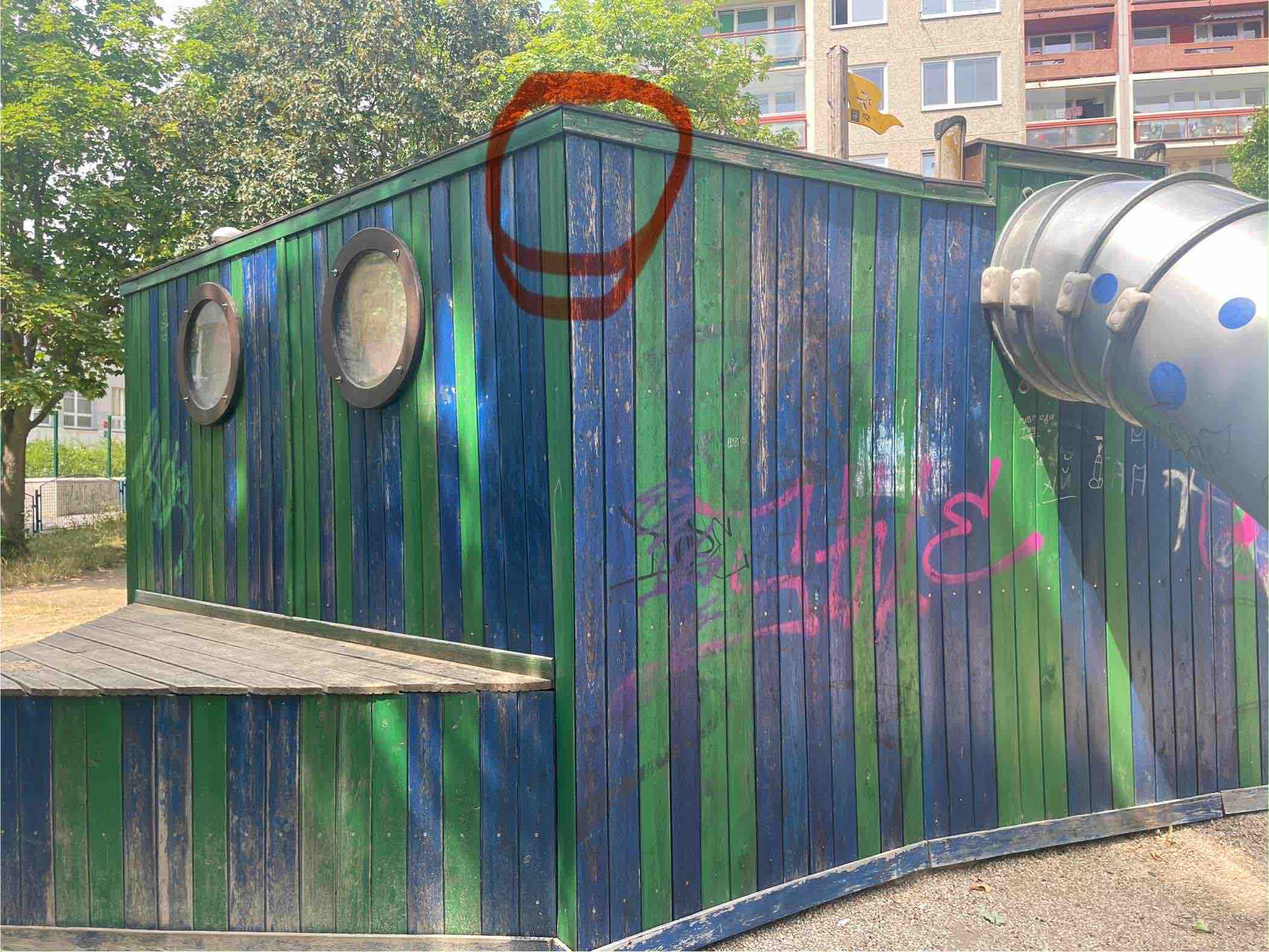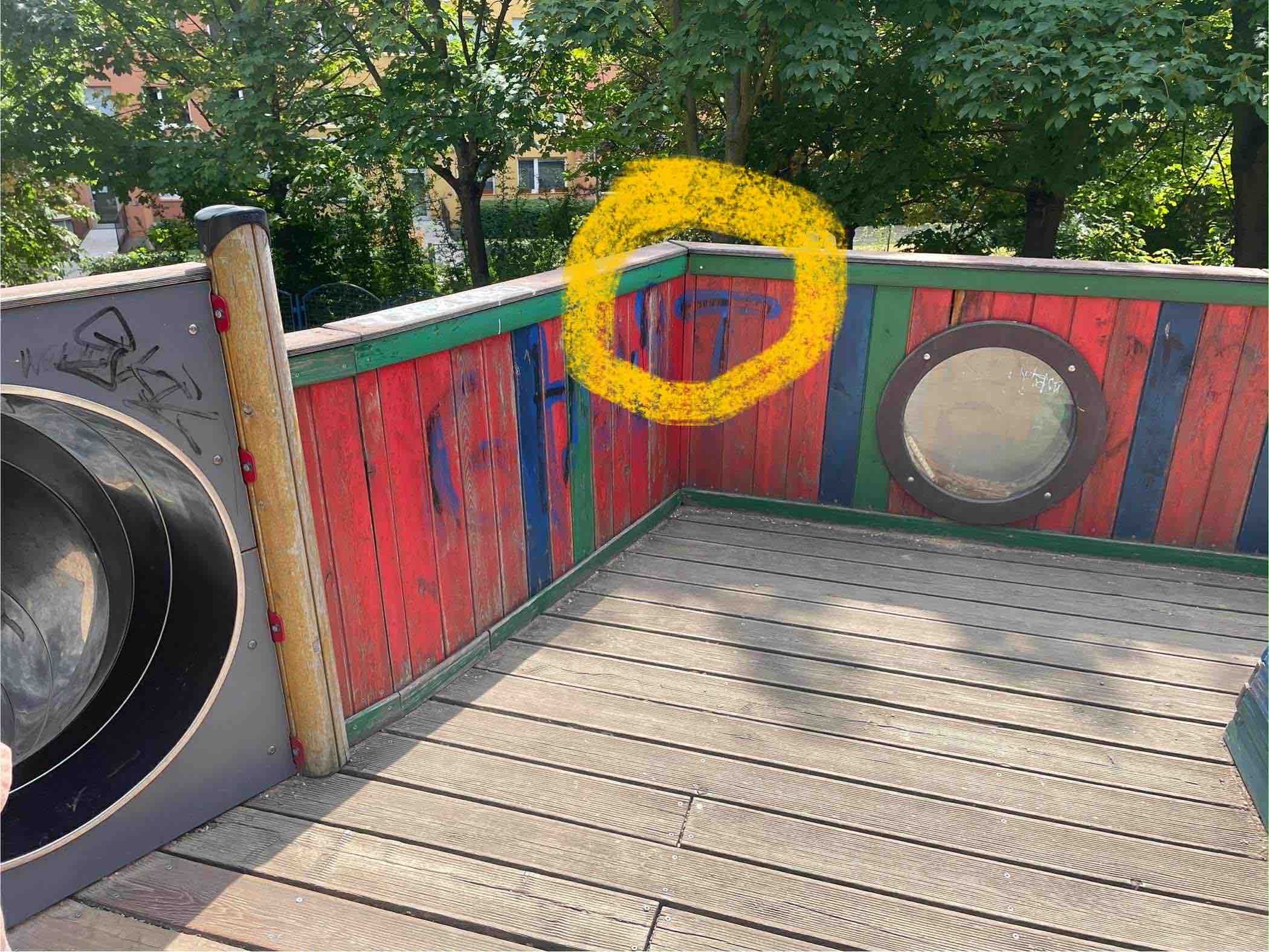 Ve škvíře dřevěné konstrukce na dětském hřišti je vosí menší hnízdo