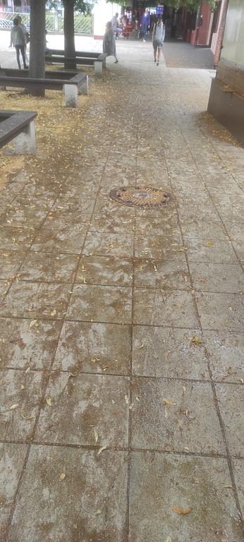 Velmi znečištěné chodníky před kebab na Luka, nepořádek ze stromů