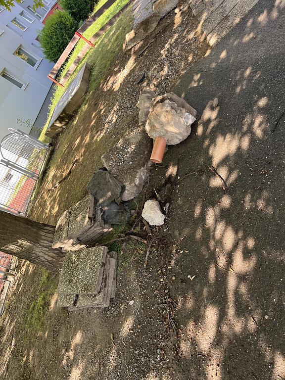 Již několik dní odložený materiál z opravy. Proč tam tedy nenechali ohradník stavby, zvlášť takto u dětského hřiště?
