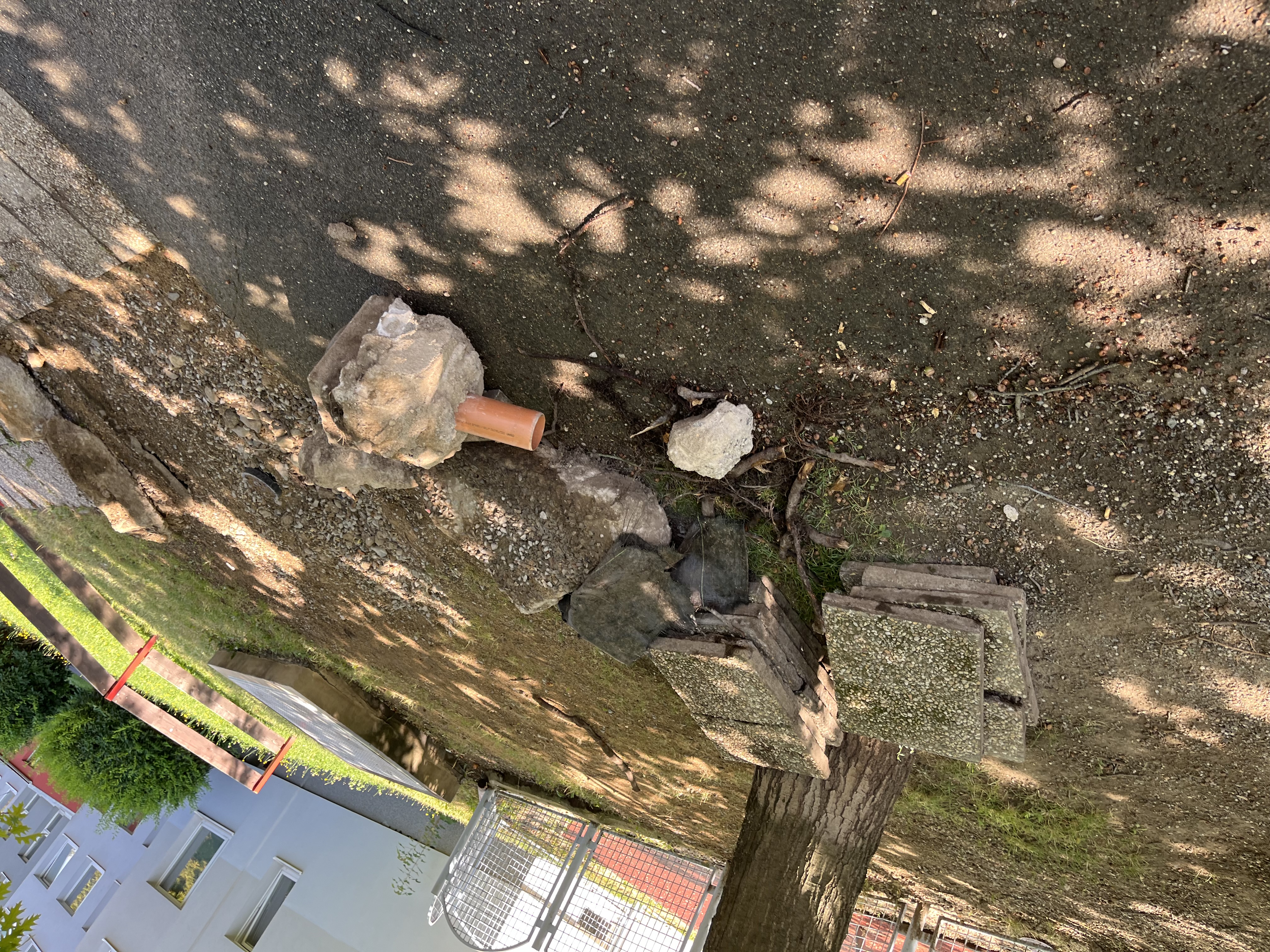 Již několik dní odložený materiál z opravy. Proč tam tedy nenechali ohradník stavby, zvlášť takto u dětského hřiště?