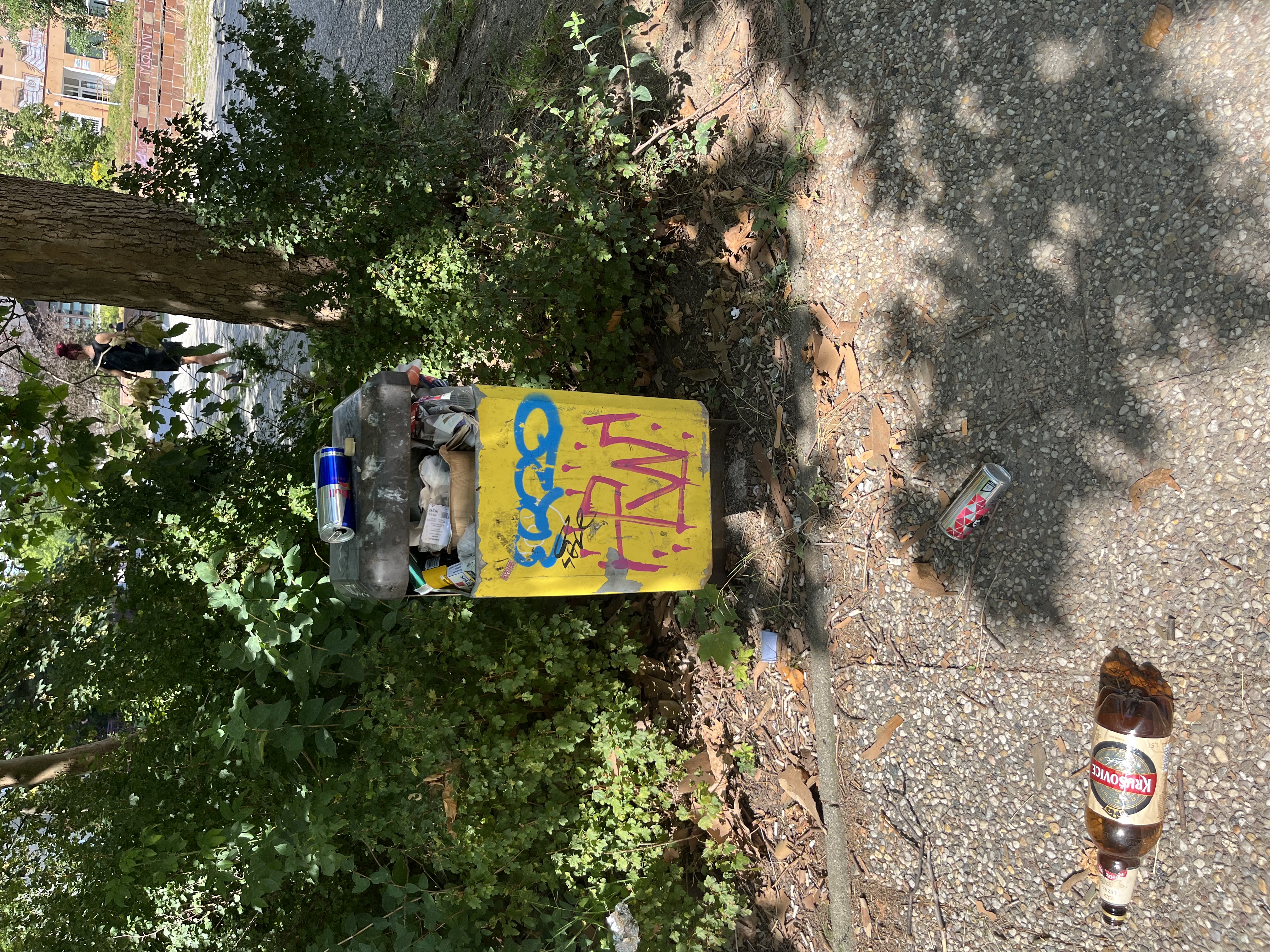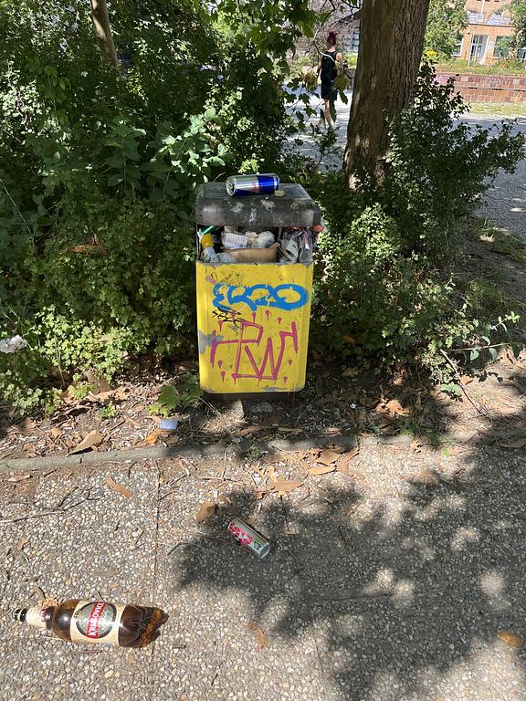 Přeplněné koše na odpadky, odpadky se válejí kolem. Koše jsou ve špatném stavu.