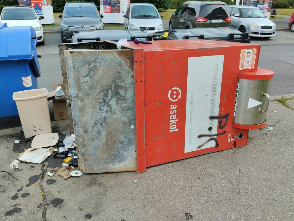 Dobrý den, Vámi nahlášená závada byla postoupena vlastníkovi kontejneru tj. společnosti Asekol k zajištění nápravy. Děkujeme za upozornění.