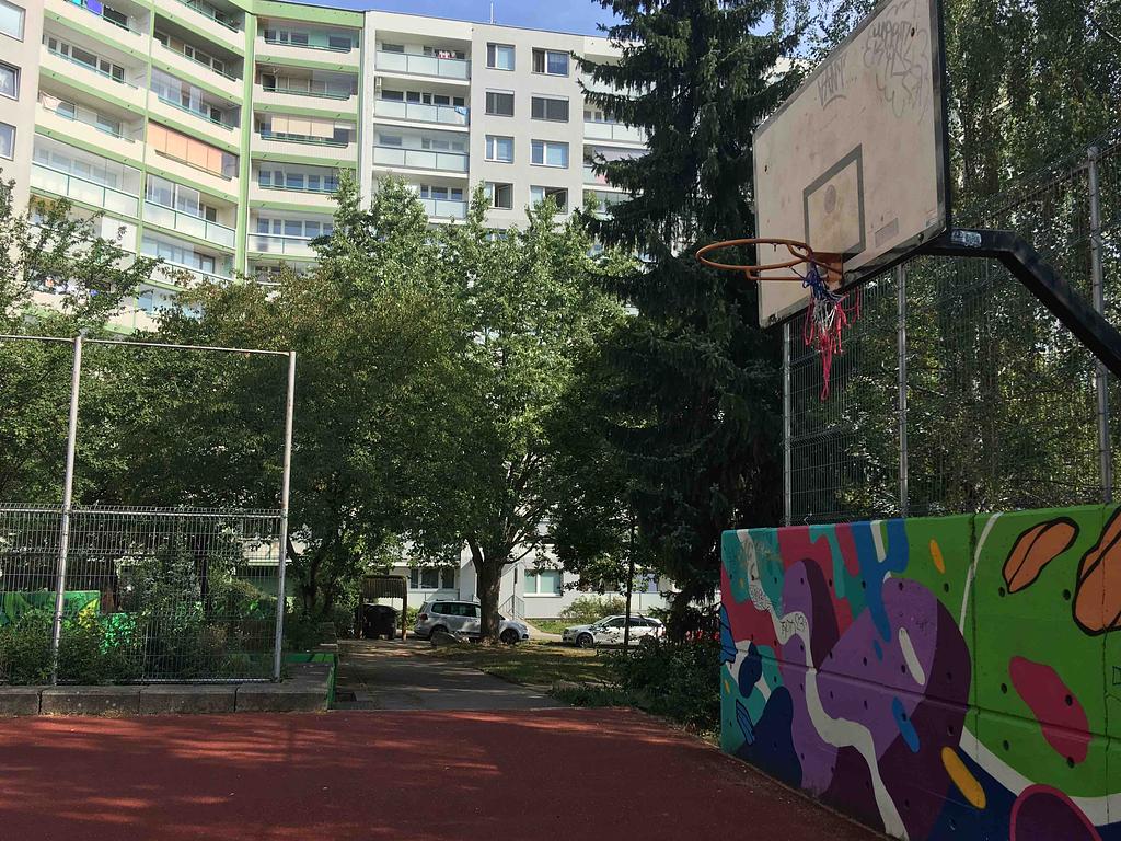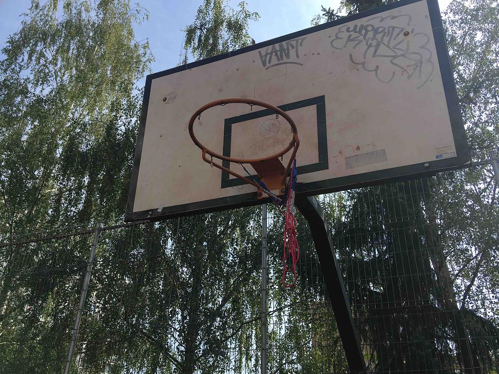 Zničené koše na basket u toho, kde nehrozí ze mic uteče do silnice je praskla deska a srouby a hrozí nebezpečí padu někomu na hlavu