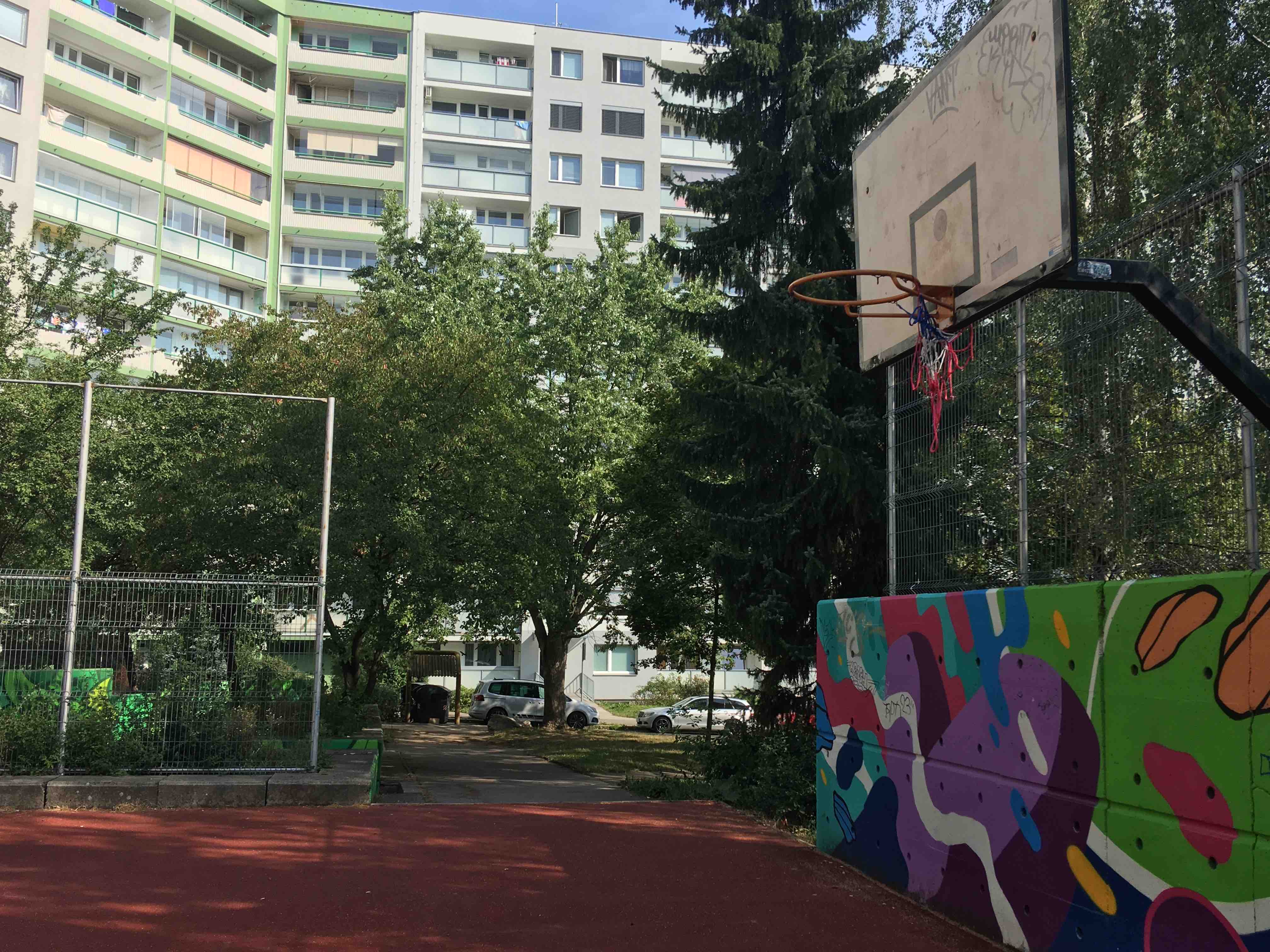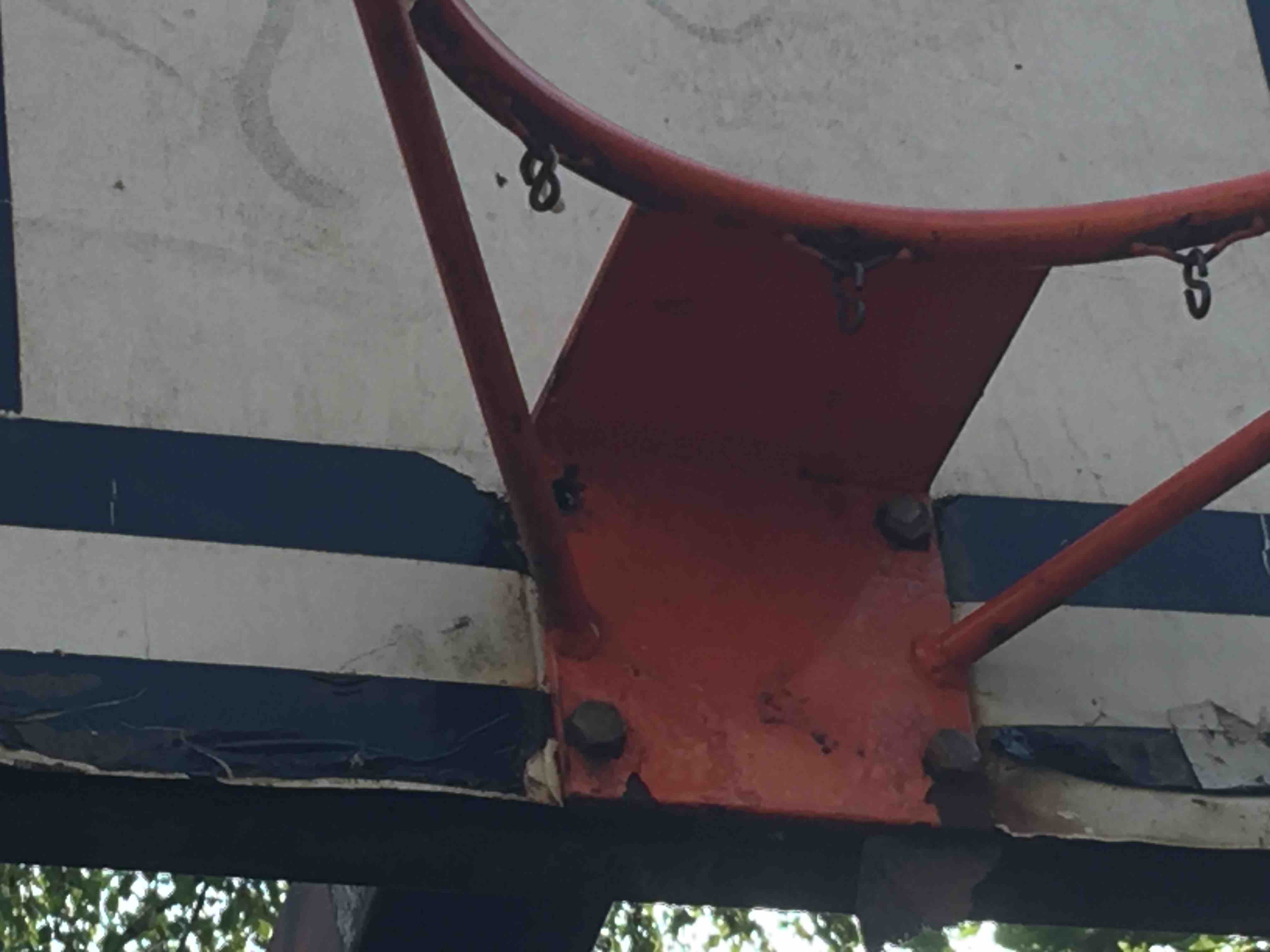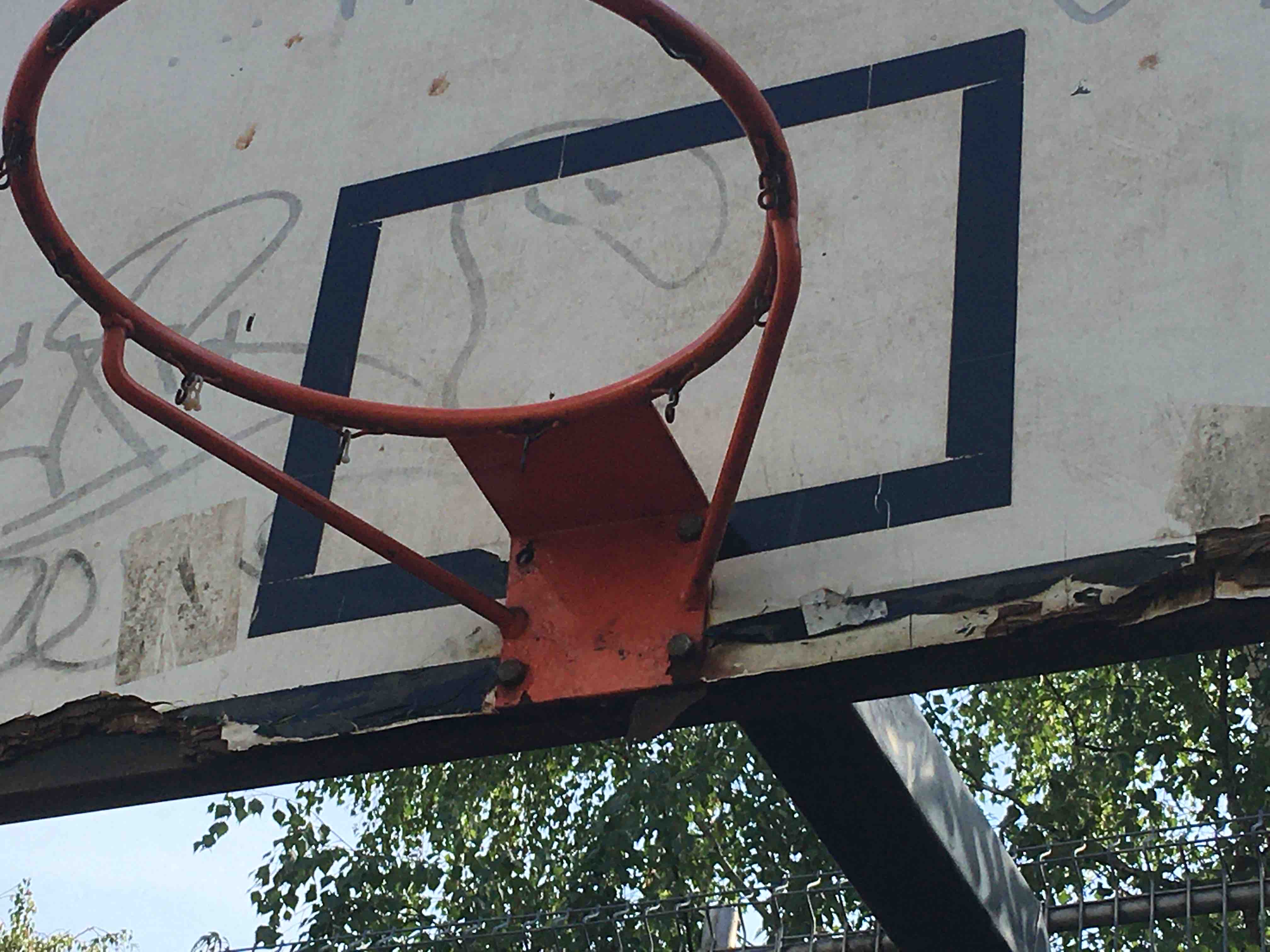 Zničené koše na basket u toho, kde nehrozí ze mic uteče do silnice je praskla deska a srouby a hrozí nebezpečí padu někomu na hlavu