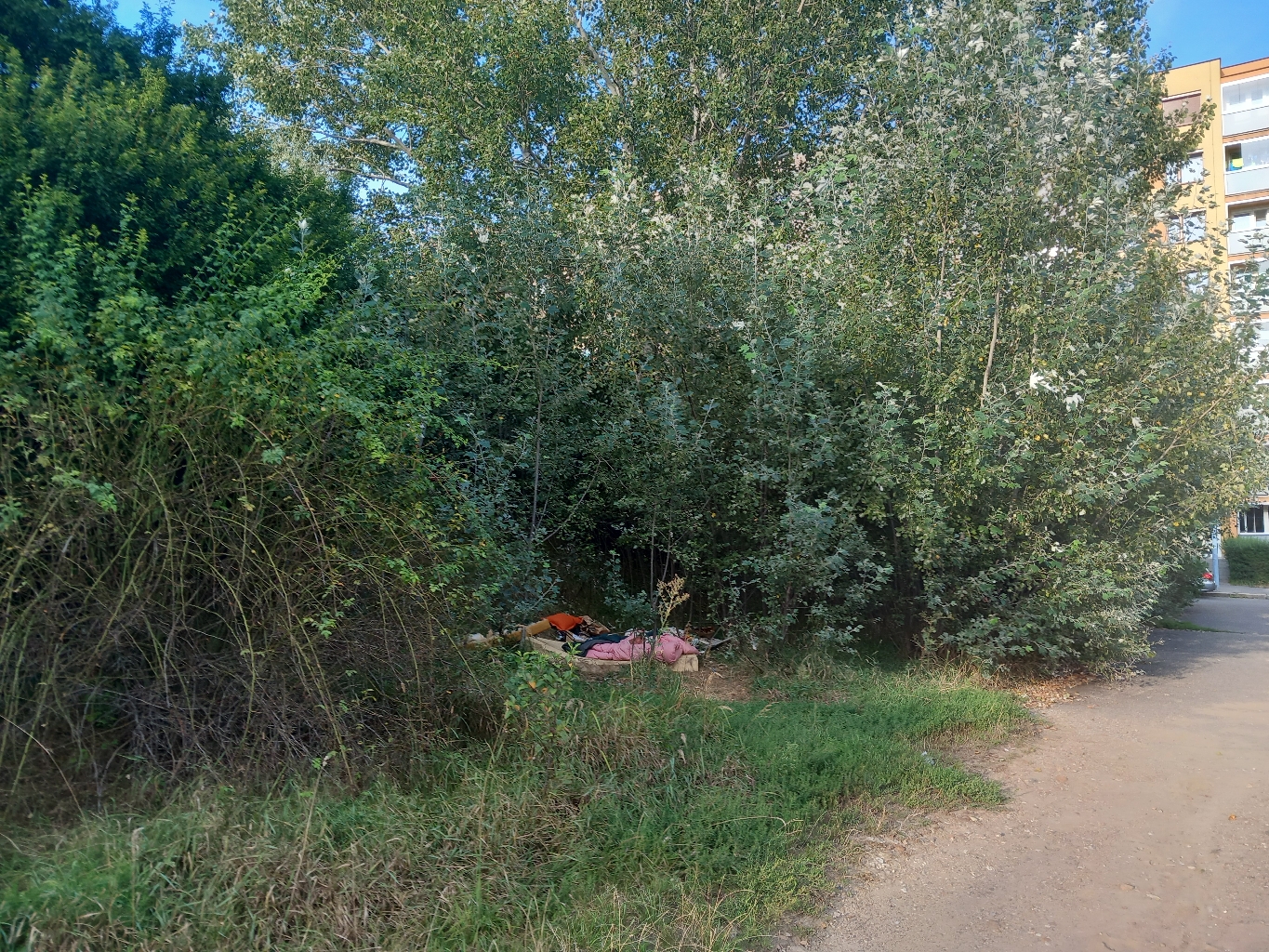 Znovu zase bezdomovci v křoví. Nešlo by to křoví posekat? Uklidí se to a stejně se za chvíli nastěhují zpátky.