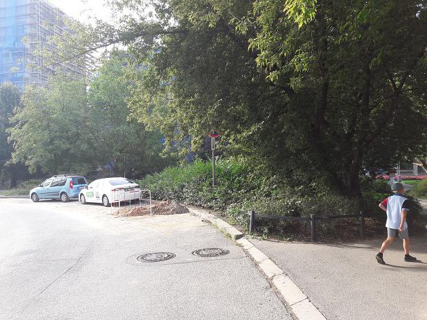 ve vyústění Vlachovy ulice do Šostakovičova náměstí je značka vyznačující konec úseku zákazu zastavení téměř zakryta větvemi stromu.