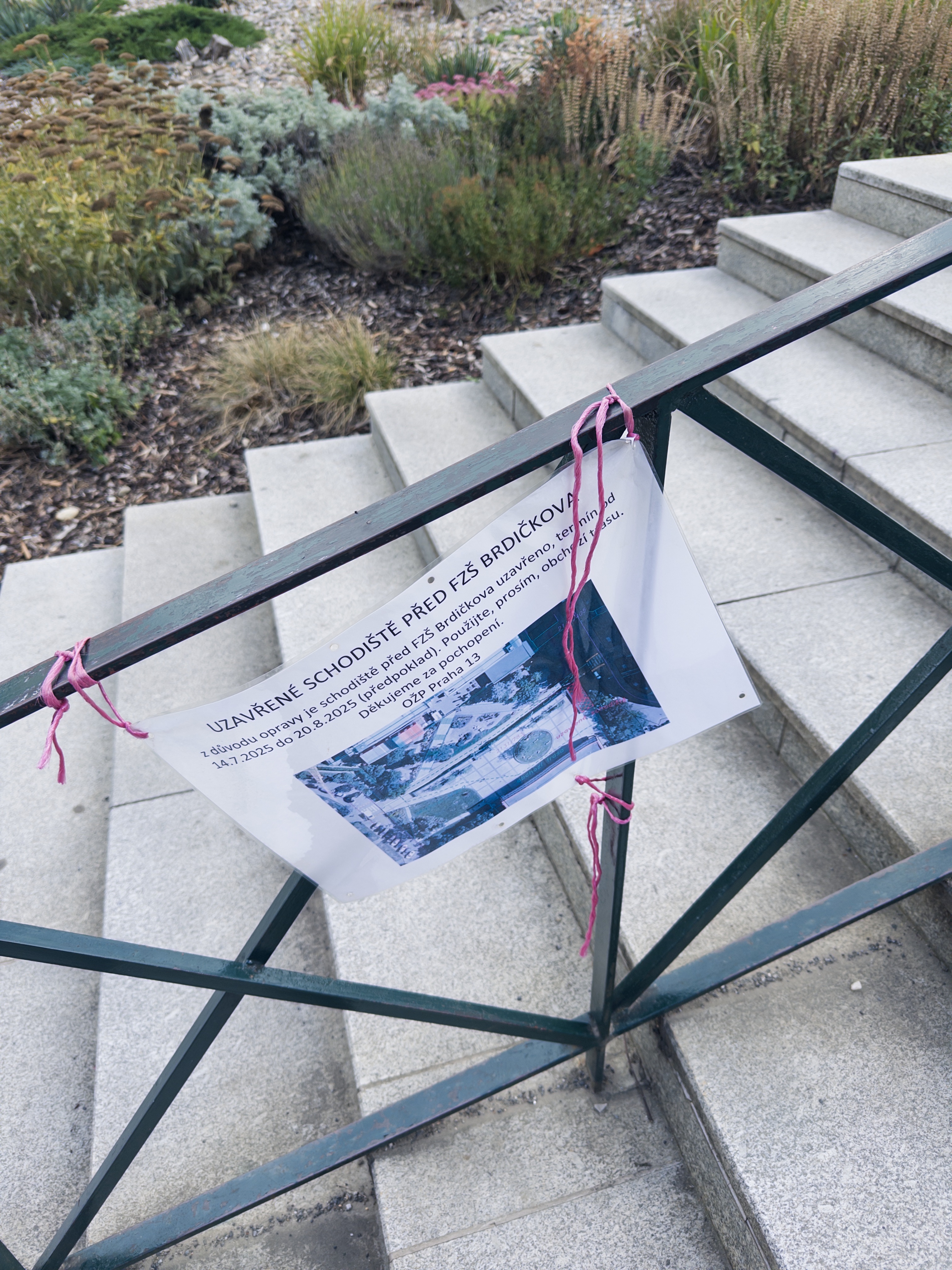 Dobrý den, oprava schodiště byla dokončena v pátek 22.8. 2025, z tohoto důvodu nemohly být rozmístěné informační cedule s obchozí trasou odstraněny dříve. V současné době jsou již sundány. Pokud by ještě nějaké byly spatřeny, chtěli bychom Vás požádat o jejich odstranění nebo informaci, kde se nachází. Děkujeme za podnět, OŽP.