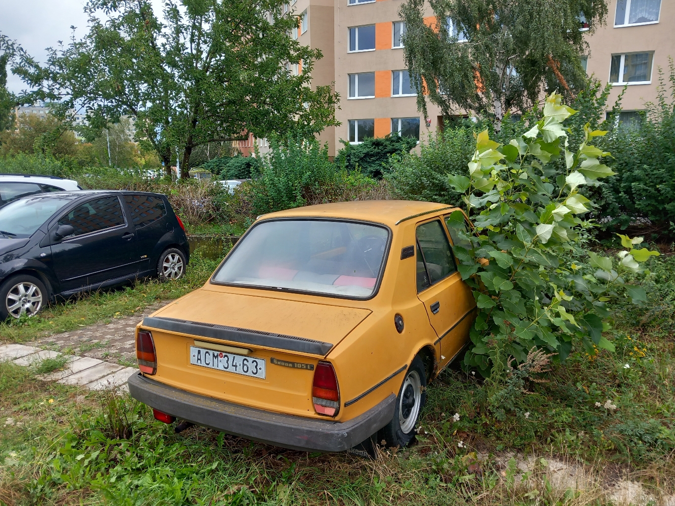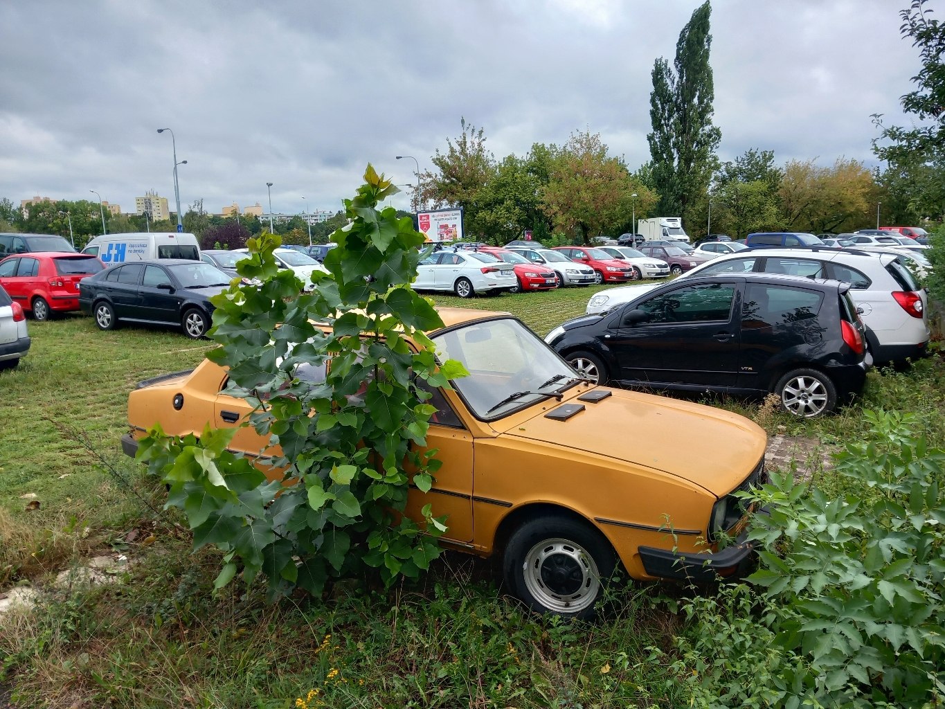 Stará škodovka na parkovišti Fantova. Vypadá, že už dlouho nejela.