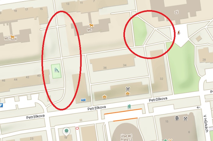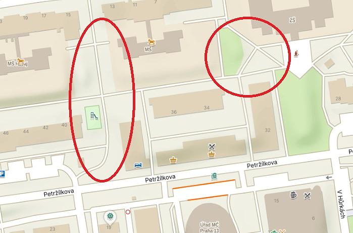 1. hlavní komunikaci pro pěší od metra směrem k ulicím Mezi školami/Dominova/Blatného – zde je funkční jedna jediná lampa, a to až u přechodu pro chodce Mezi školami.