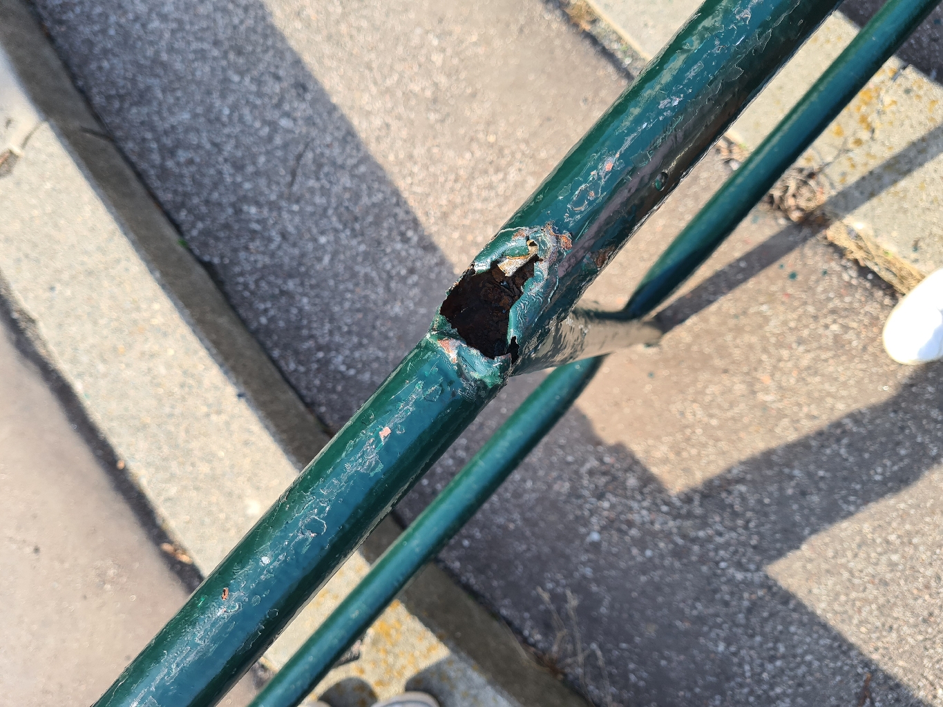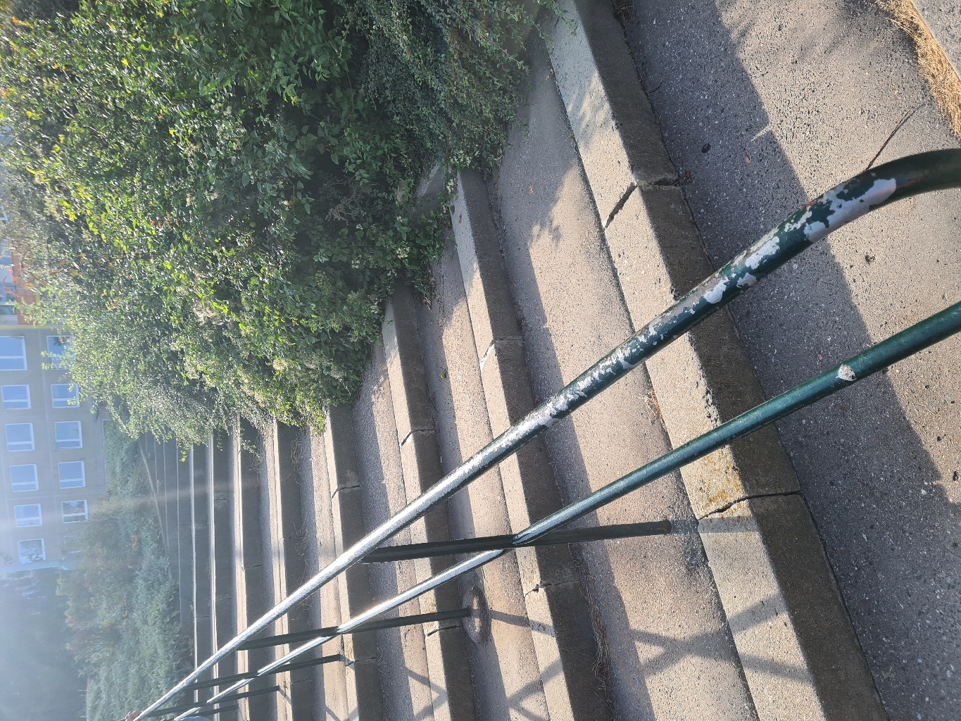 ostré poškozené zábradlí u schodů. dítě se o něj pořezalo. Stožár VO č. 508733