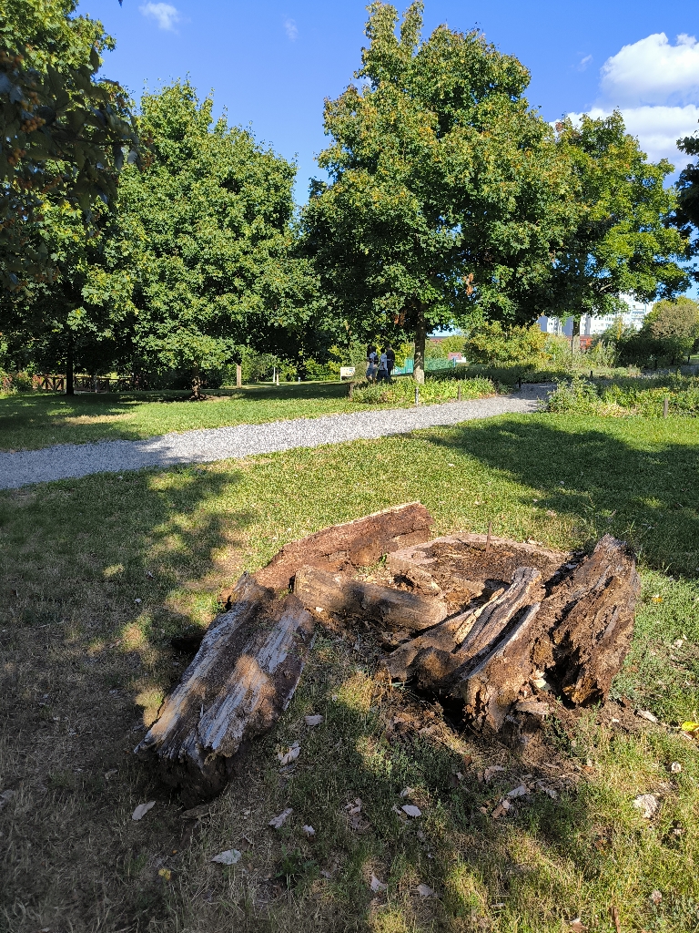 V parku,rozpadla kláda, kolík volně stojící v betonovém základu, nebezpečí úrazu