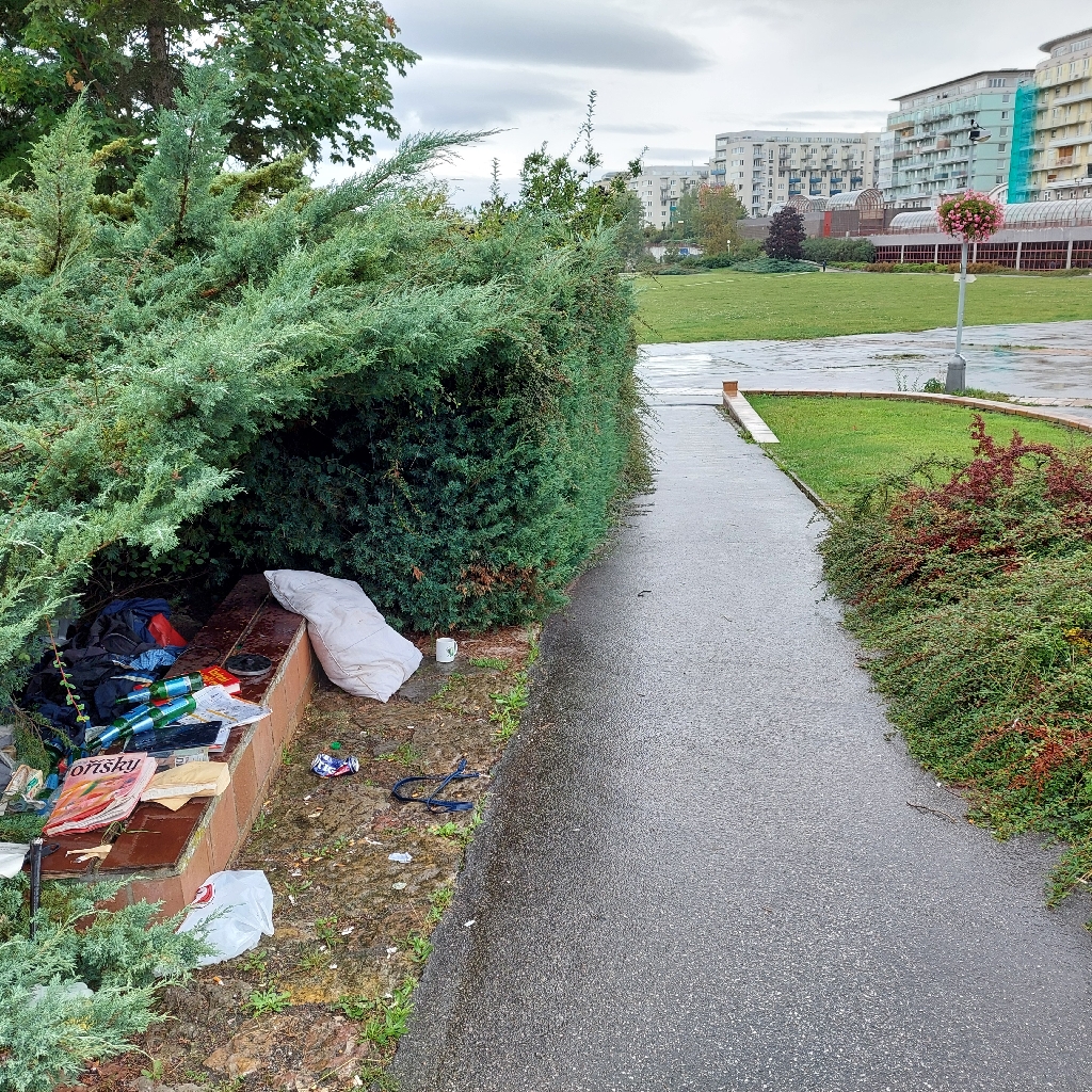 V prostoru s lavičkou pod zelení je pravděpodobně hnízdo bezdomovců.Je zde nepořádek a spousta natahaných věcí.Přímo proti radnici přes náměstí.Městská policie ze svých aut asi nedohlédne…