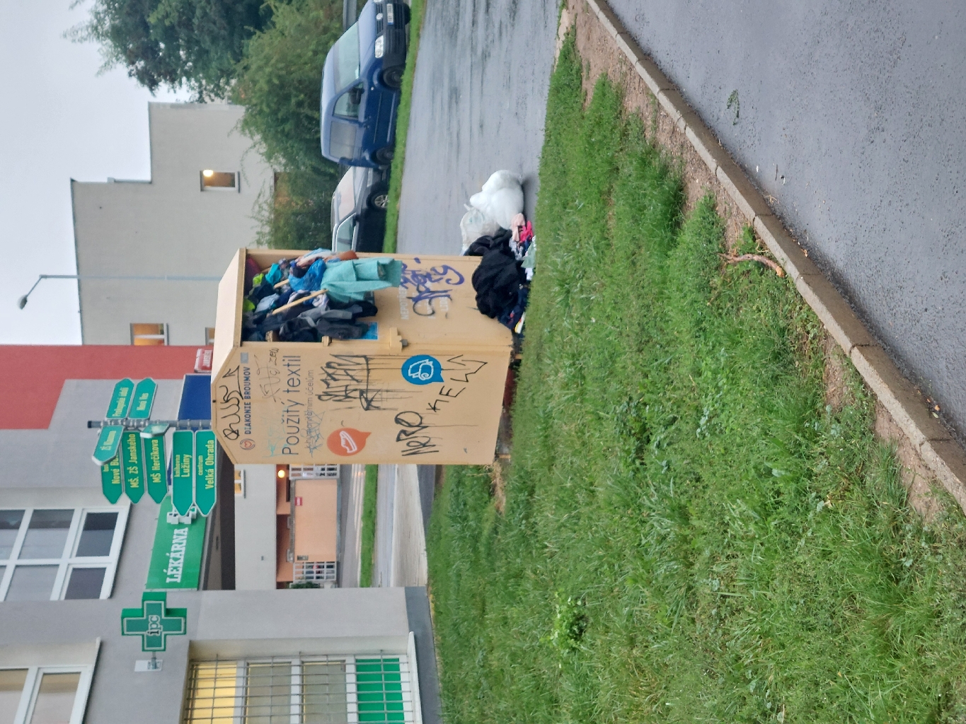 Kontainery na oblečení mají malou kapacitu a lidé dávají oblečení i mimo. Foto je u polikliniky/posty v ulici Janského. Hned vedle je uzamčený kontainer na papír. Lidé to bobužel nechápou a dávají odpadky hned vedle na trávu. Proč tam není veřejný odemčený kontainer? Obecně kapacita kontainerů na papír je na sídlišti malá. Jen 1 věc vyhozená vedle kontaineru svádí k hromadění dalšího, odpad mimo kontainer není odvezen, dochází k z nehodnocení odpadu a obhvatelé ani nemaji další možnost. Nedaly by se po sídlišti nainstalovat velkokapacitní podzemní kontainery? Takto to třeba vyrešili v Mostě.