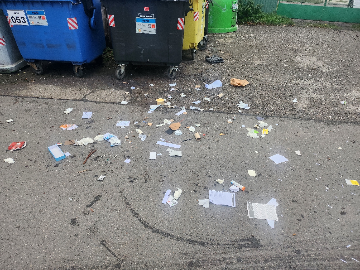 Dnes ráno v 7:30 vyváželi popeláři papír v ulici K Hájům. Část se jim vysypala na zem. Nechali to tam a odjeli.