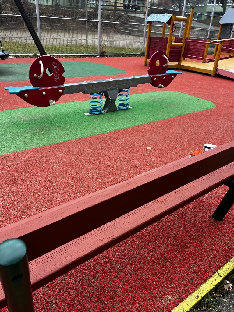 Praskla pruzina na houpacce viz foto, hriste ve vnitrobloku Dominova ulice.