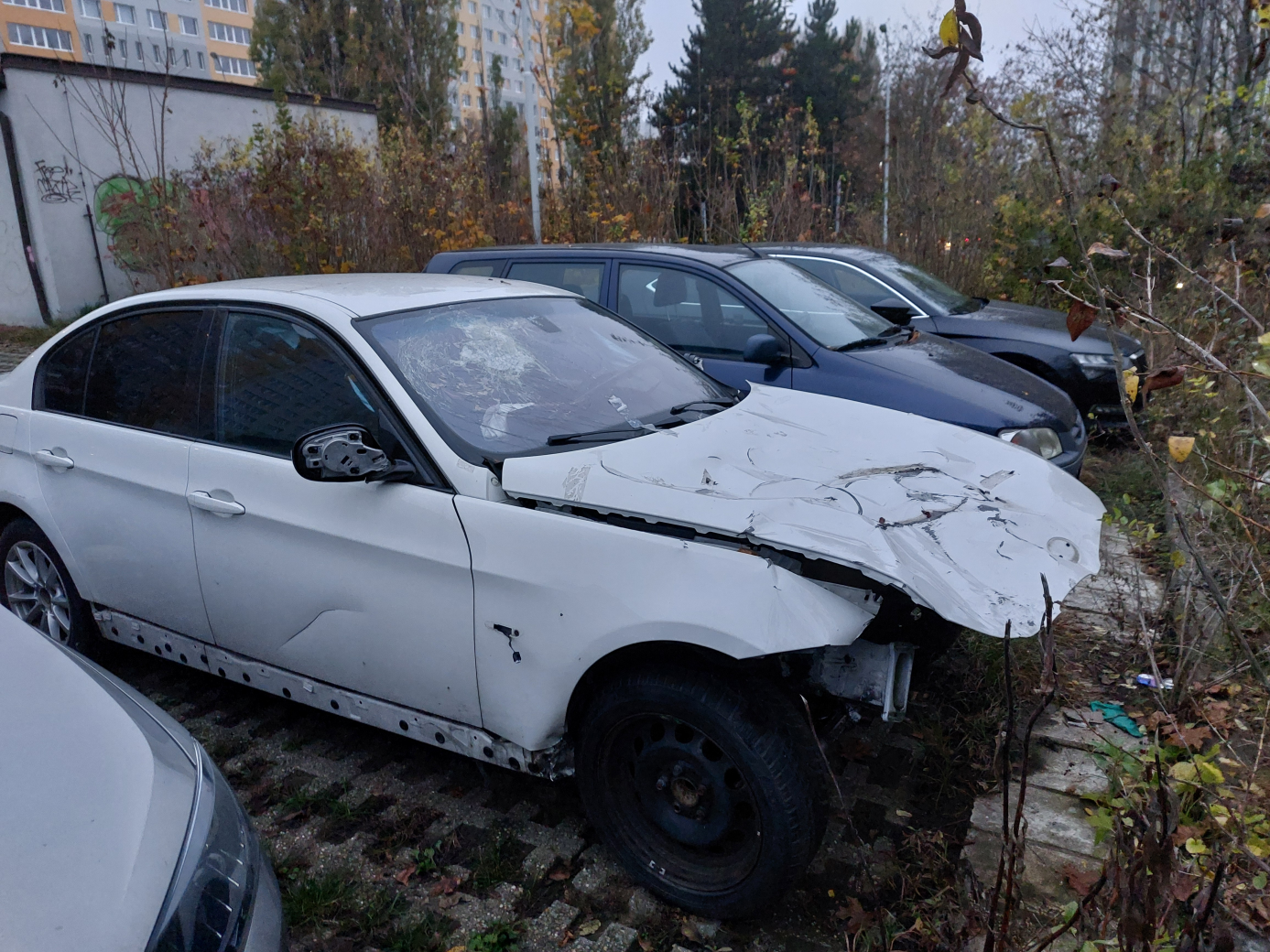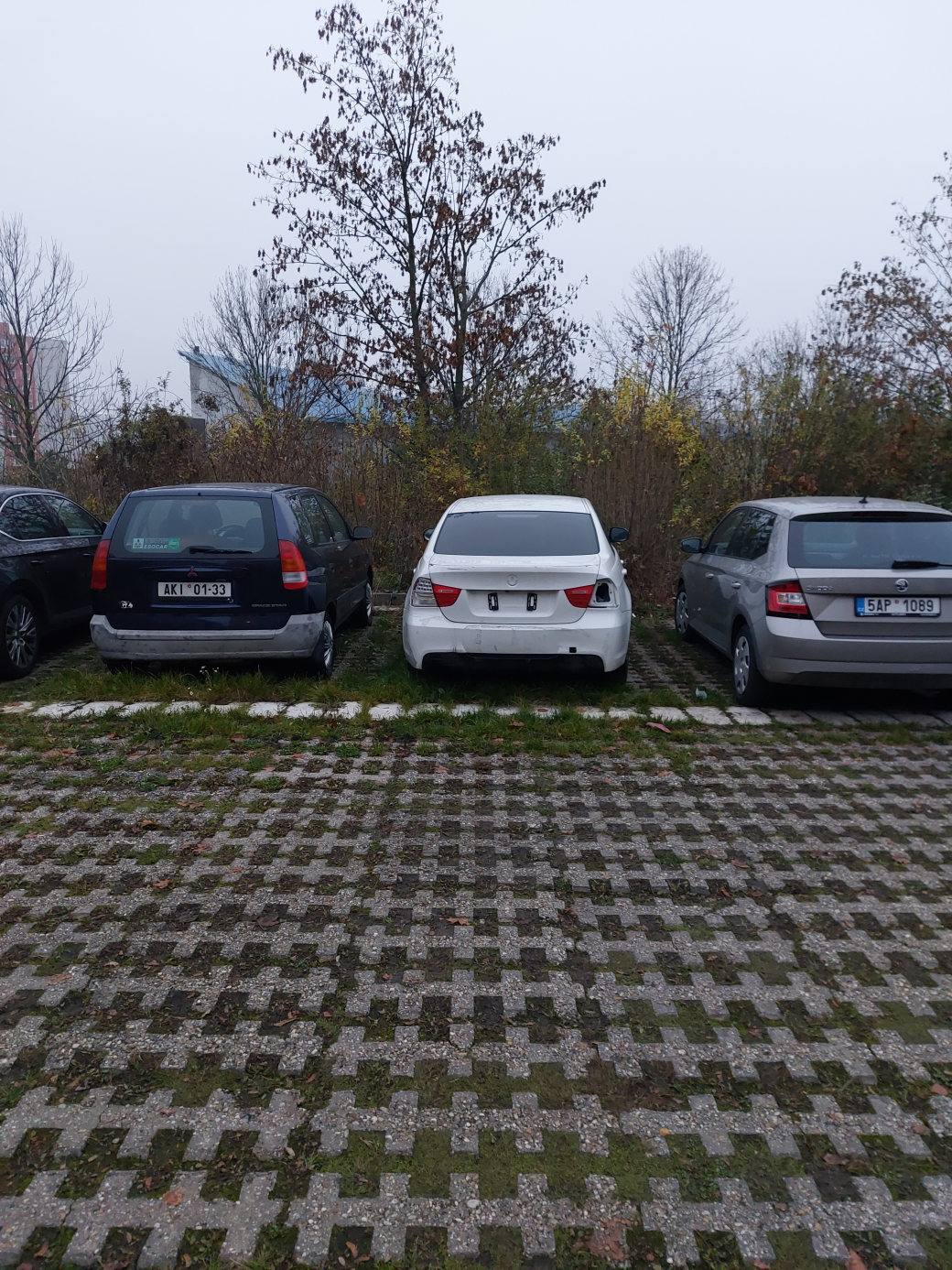 Na parkovišti proti vjezdu z Bellušovy 1829 zabírá místo silně nabouraný vrak vozidla bez SPZ.