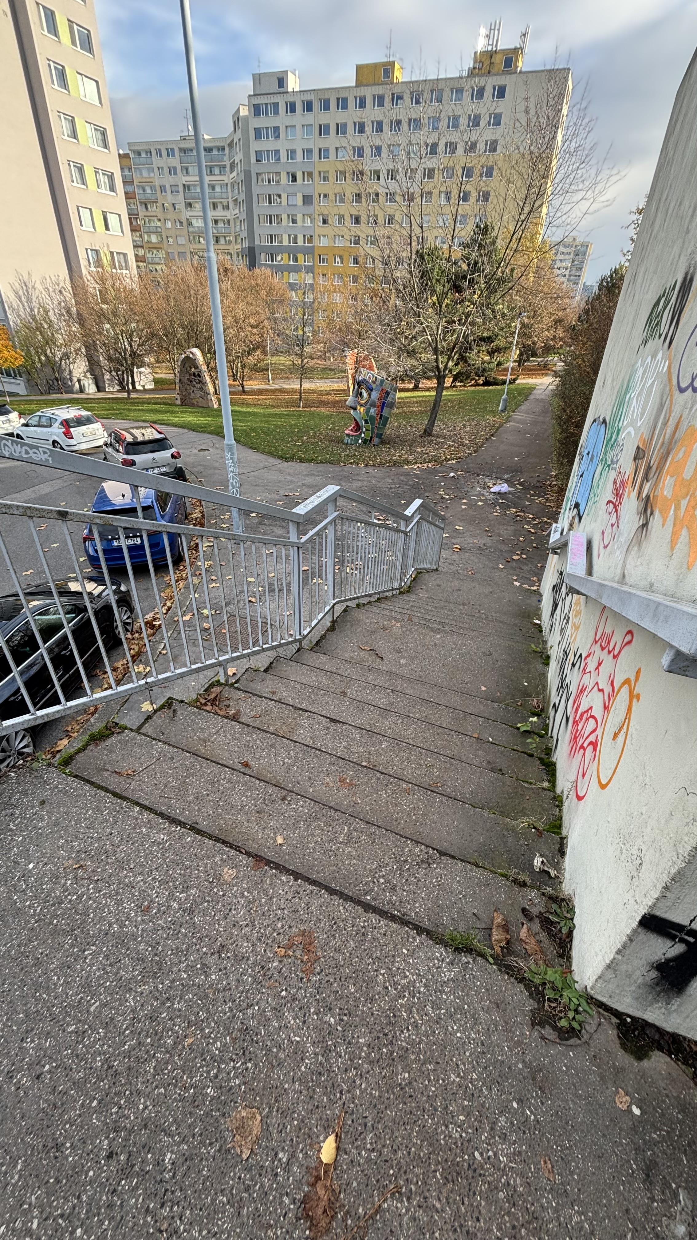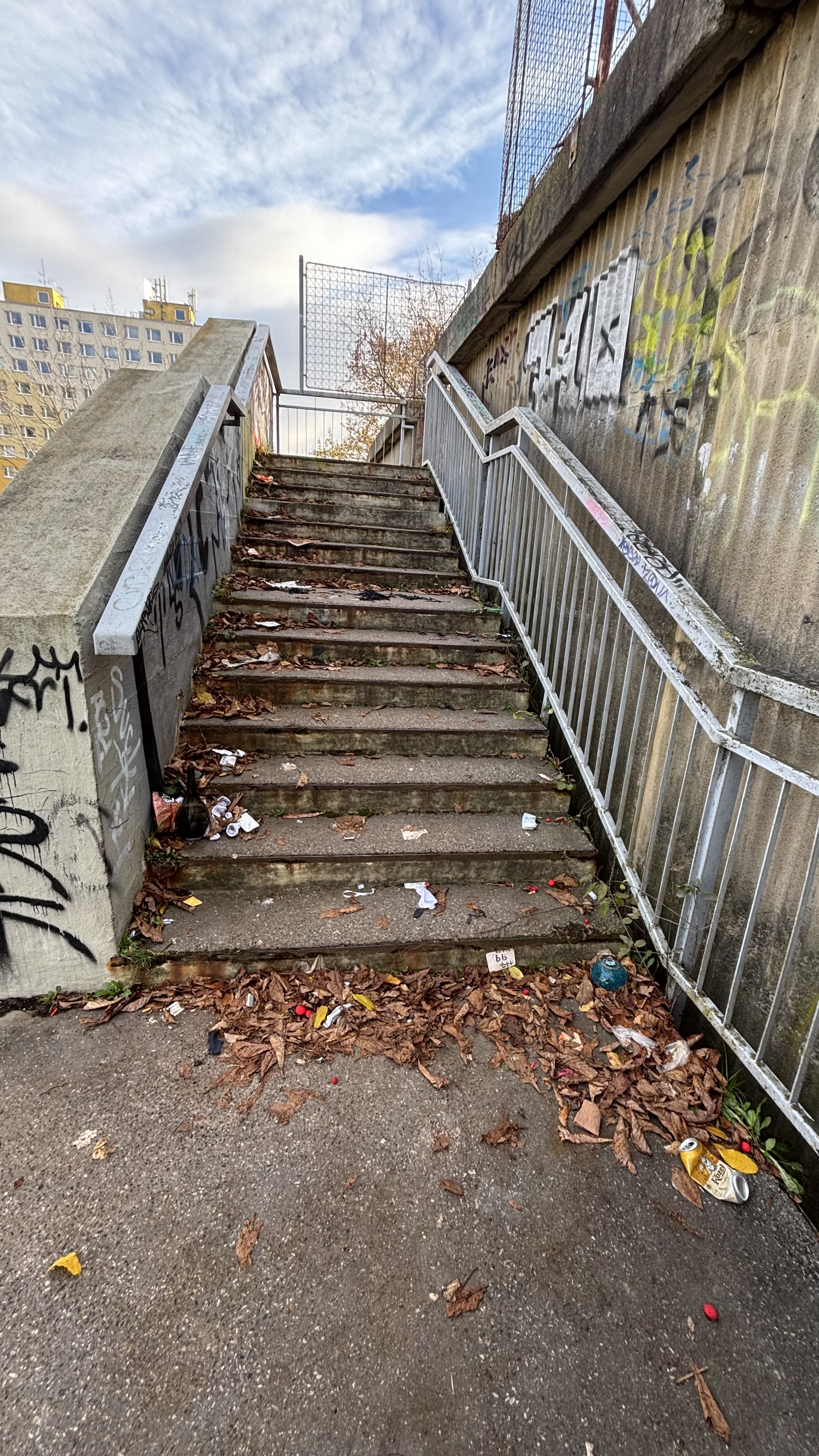 Nutný úklid, po schodech děti chodí do ZŠ Bronzová a do centralního parku. Nebezpečný odpad.