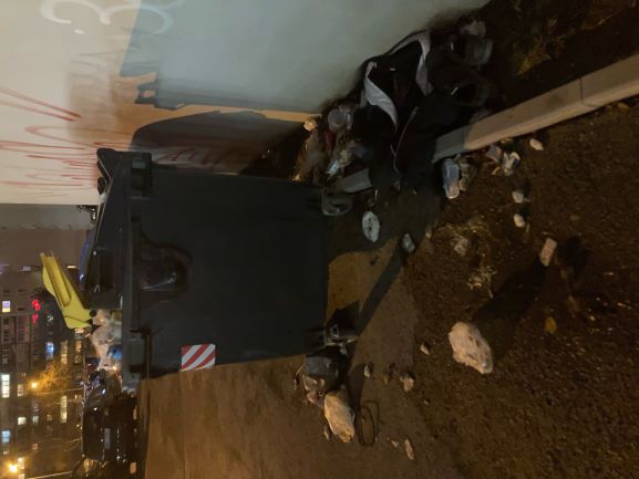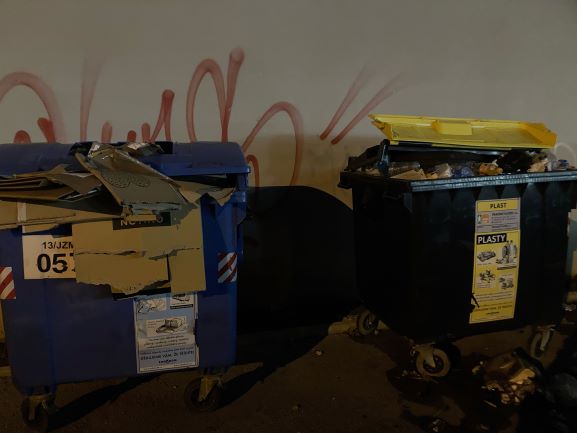 Prosím o úklid kontejnerů a nejbližší okolí v Nušlově ulici (mezi č. 2 a 4., poblíž nájezdu do garáží).