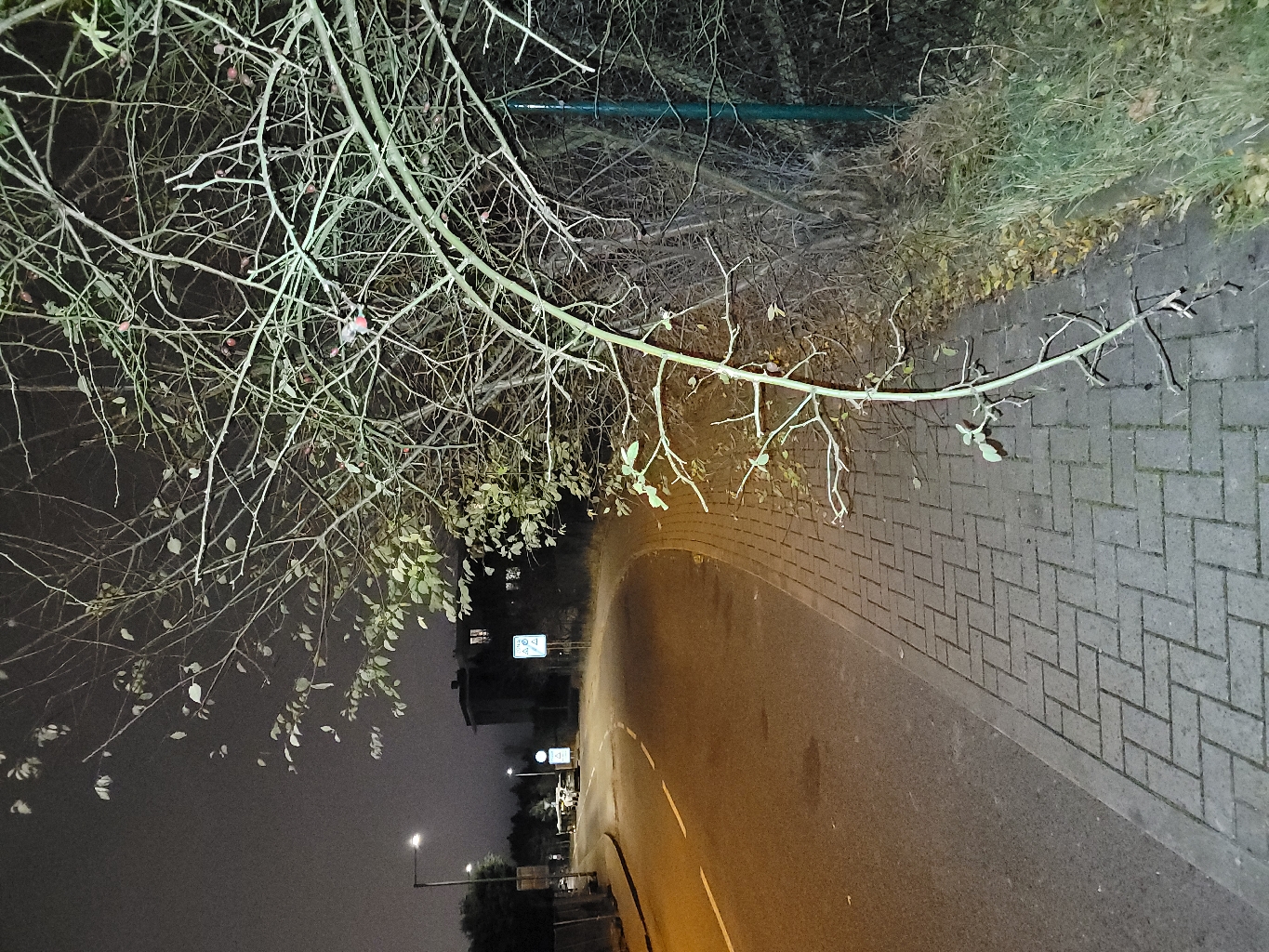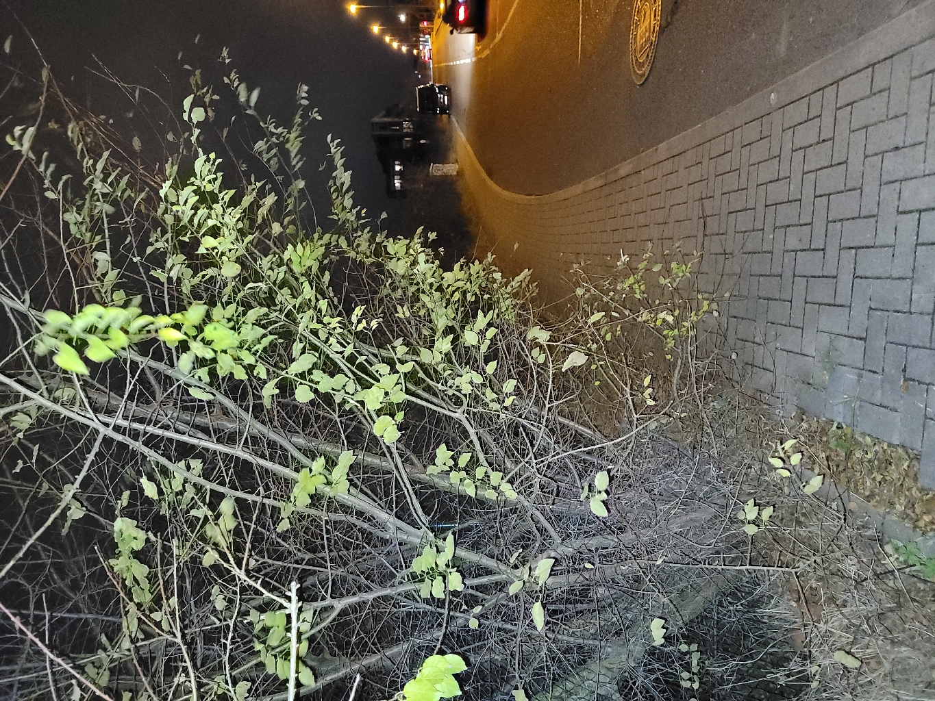 vegetace přerůstající do prostoru chodníku. Fotografie je udělaná z metrové vzdálenosti od křoví. Za tímto křovím jsou sipky, které chodec s nasazenou kapucou v zimě / tmě nezaregistuje, dokud se do nich nezamotá. problém se nachází přes ulici od sloupu osvětlení 524833.