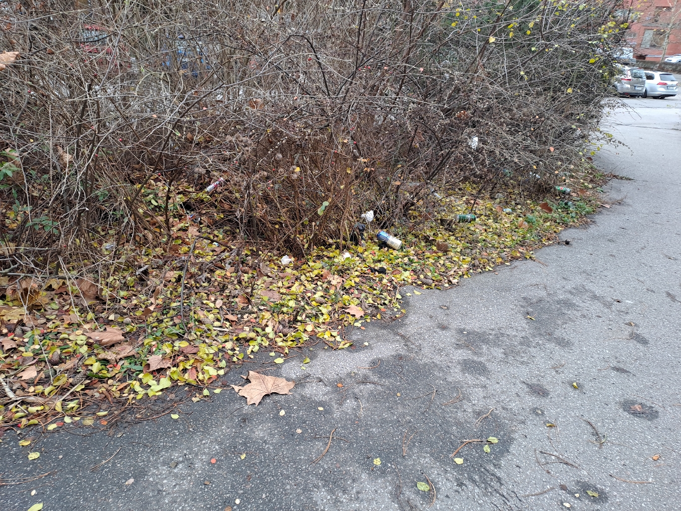 velký nepořádek, plechovky v křoví, neshrabane listí