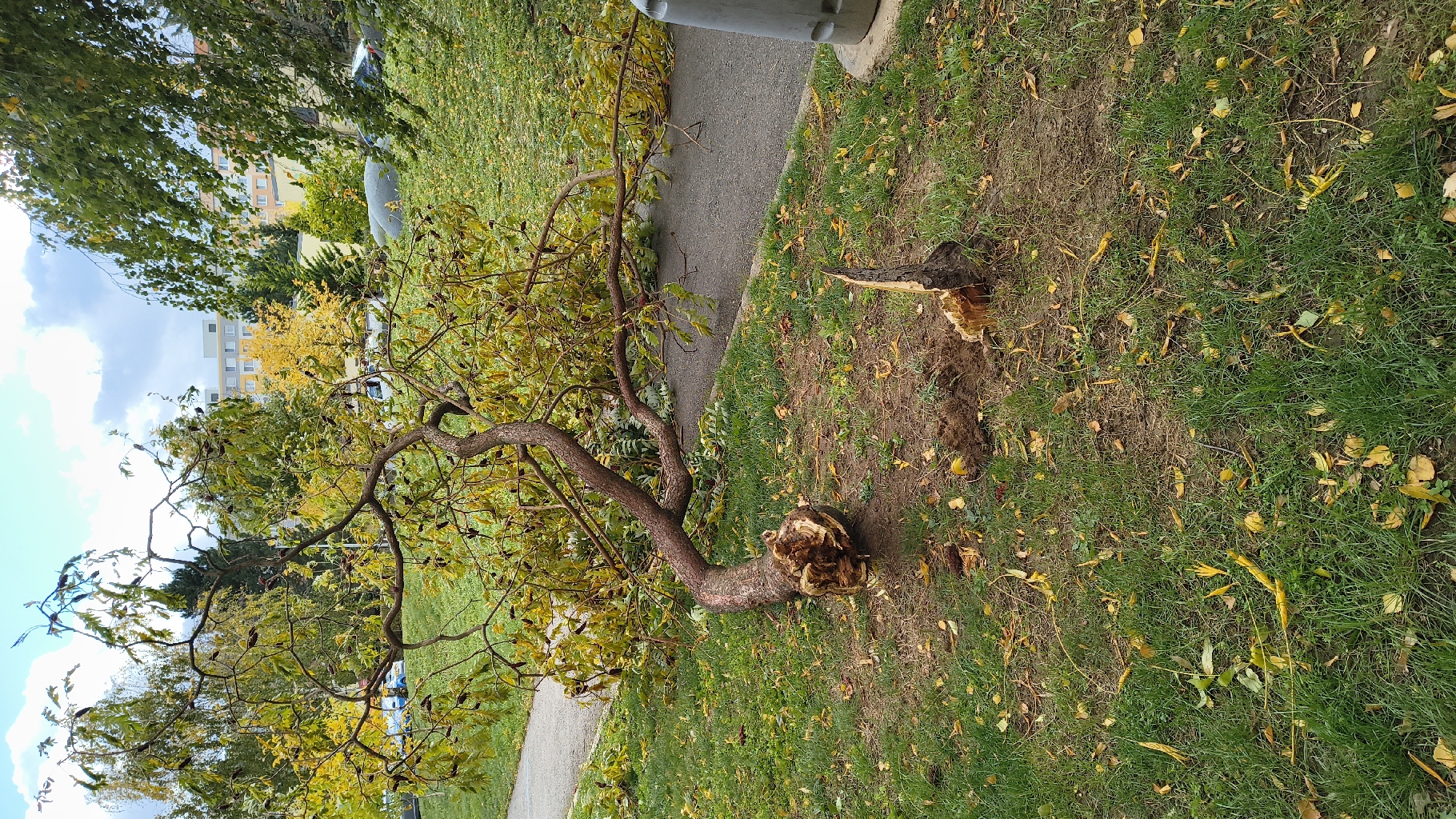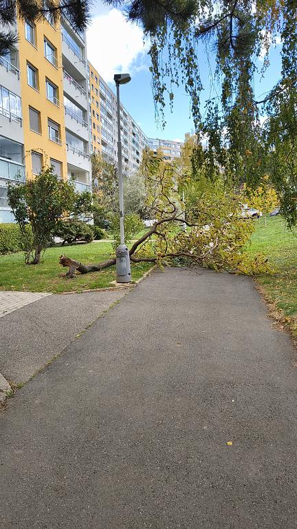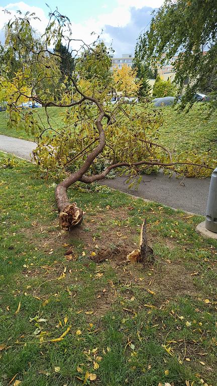 Zlomený strom poryvem vysokého větru, vnitroblok Neustupného