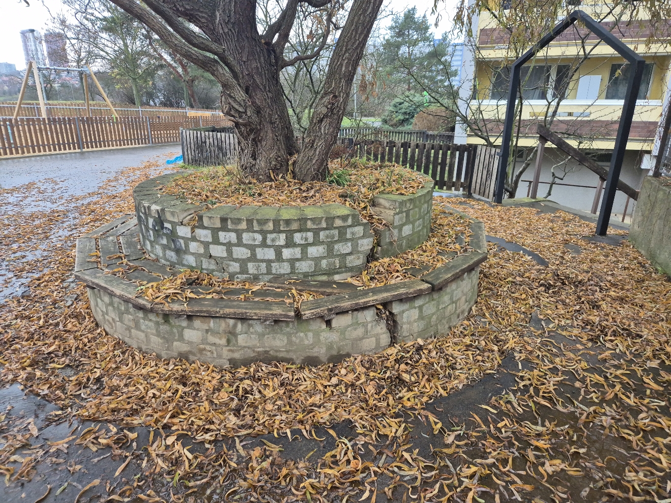 Popraskaná zídka, děti ji rozebírají, laviičky rozbité
