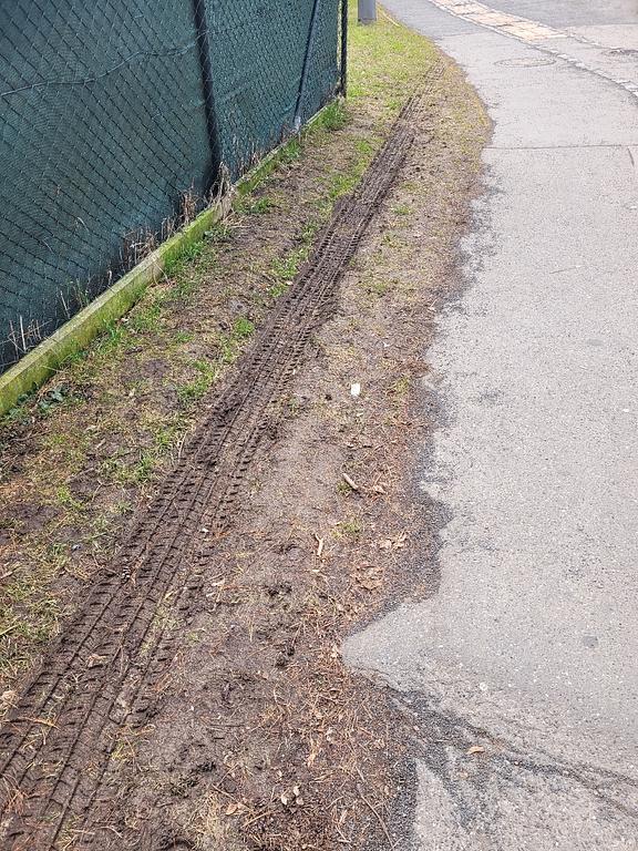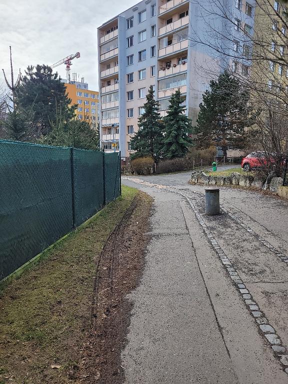 posledních letech se situace značně zhoršila jezdí autama všude velký má ani z něho nevylezou jenom projedou a rozšvachtají trávníky Hrůza je to. Jedná se o chodník poblíž ulice Floglova, orientační bod stožár VO č. 509516.