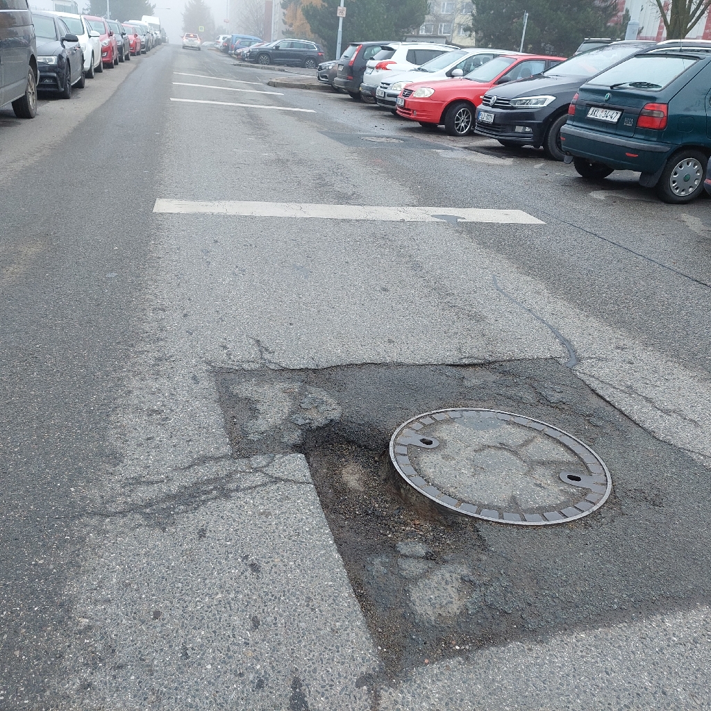 Velká díra ve vozovce v ulici V Hůrkách v nájezdu z ulice Pod Hranicí…