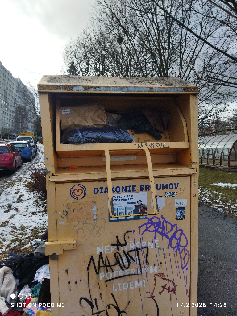Z kontejneru jsou vyhozené oblečení- kontejneru je plný