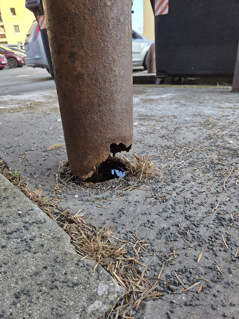 Stříška nad kontejnery před domem čp. 1583/3 v ulici Kocianova je vlivem koroze v havarijní stavu.