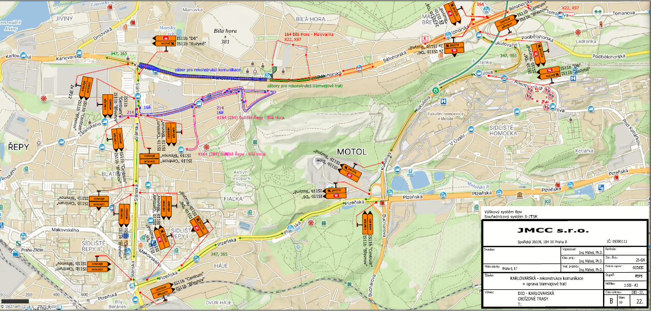 Uzavírka Karlovarské bude v uvedeném termínu (1. 7. – 31. 8. 2025) využita i pro opravu tramvajové trati v úseku Haberfeldova – smyčka Bílá Hora. Autobusy MHD obkrouží uzavřenou část komunikace po ul. Haberfeldova, Rozdělovská, Zličínská, Karlovarská směr centrum severním jízdním pásem. Tramvaje budou ukončeny ve smyčce na Vypichu. Výjezd z jednosměrné ul. Na Břevnovské pláni přes Čistovickou a vpravo na Karlovarskou směr centrum jižním pásem bude umožněn. (trasy autobusů z komunikace ul. Bělohorská 164, X22, X97).