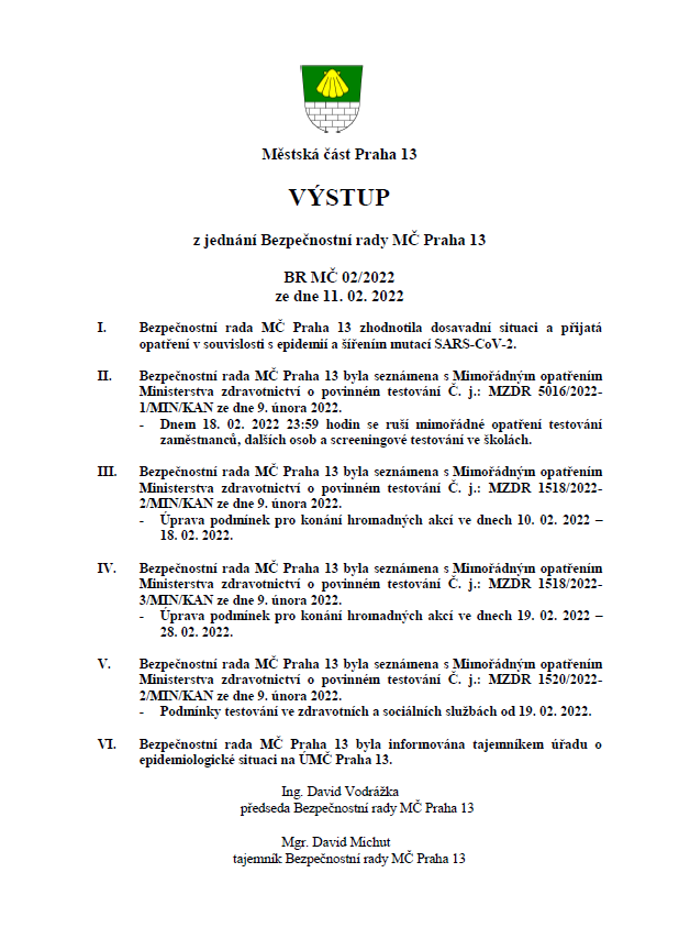 Výstup z jednání Bezpečnostní rady MČ Praha 13.