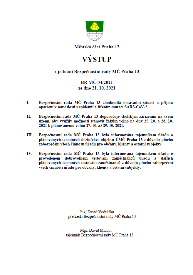 Výstup z jednání Bezpečnostní rady MČ Praha 13