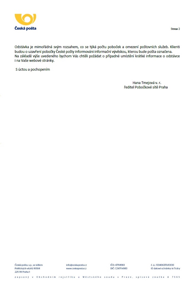 Od 18. 06. od 19.00 do 20. 6. proběhne odstávka provozu datové sítě a tím dojde k omezení pracovní doby poboček České pošty v naší městské části.