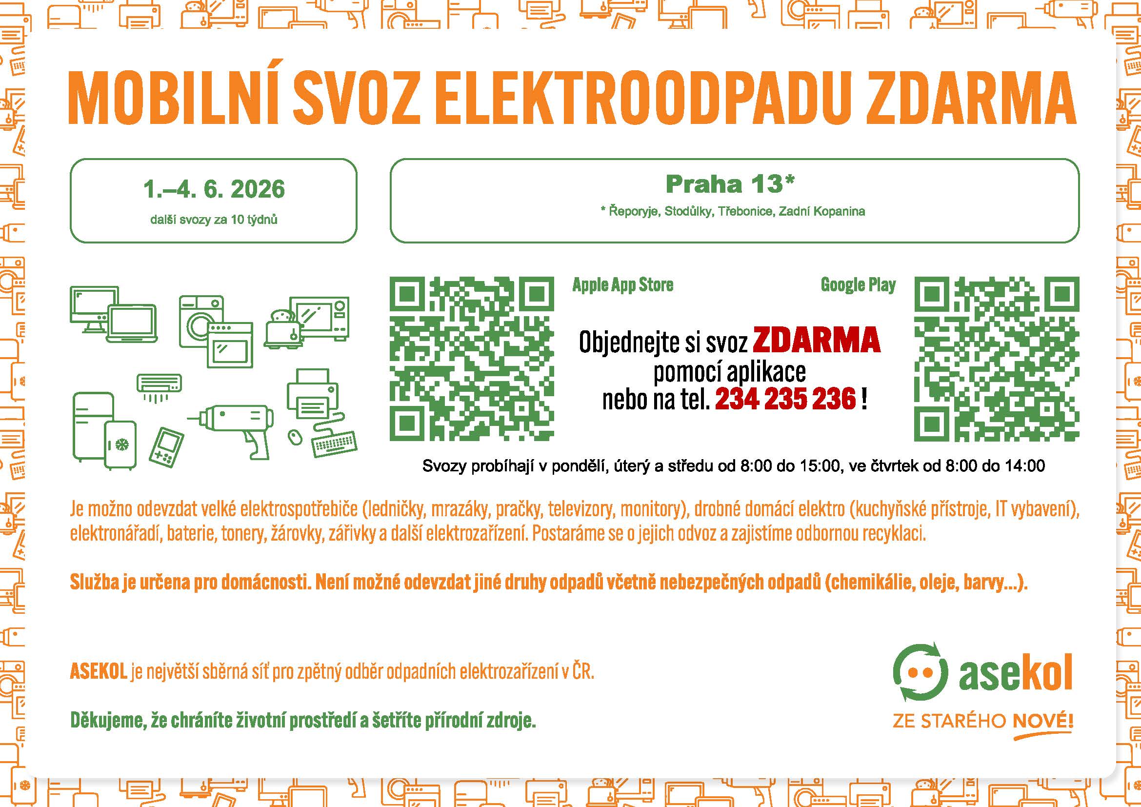 Při svozu je možno odevzdat velké elektrospotřebiče (ledničky, mrazáky, pračky, televizory, monitory), drobné domácí elektro (kuchyňské přístroje, IT vybavení), elektronářadí, baterie, tonery, žárovky, zářivky a další elektrozařízení. Bude zajištěn jejich odvoz a odborná recyklace. Služba je určena pro domácnosti. Není možné odevzdat jiné druhy odpadů včetně nebezpečných odpadů (chemikálie, oleje, barvy…). Domácnosti mají opět možnost objednat si odvoz ZDARMA prostřednictvím aplikace (Svoz elektra) nebo telefonicky na tel. 234 235 236. Objednávky od občanů budou vyřizovány o hodinu déle v době od 8 do 13 hodin.