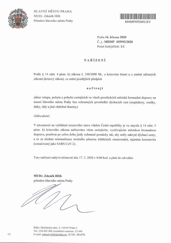 zákaz vstupu a pohybu cestujících v prostředcích MHD bez ochrany