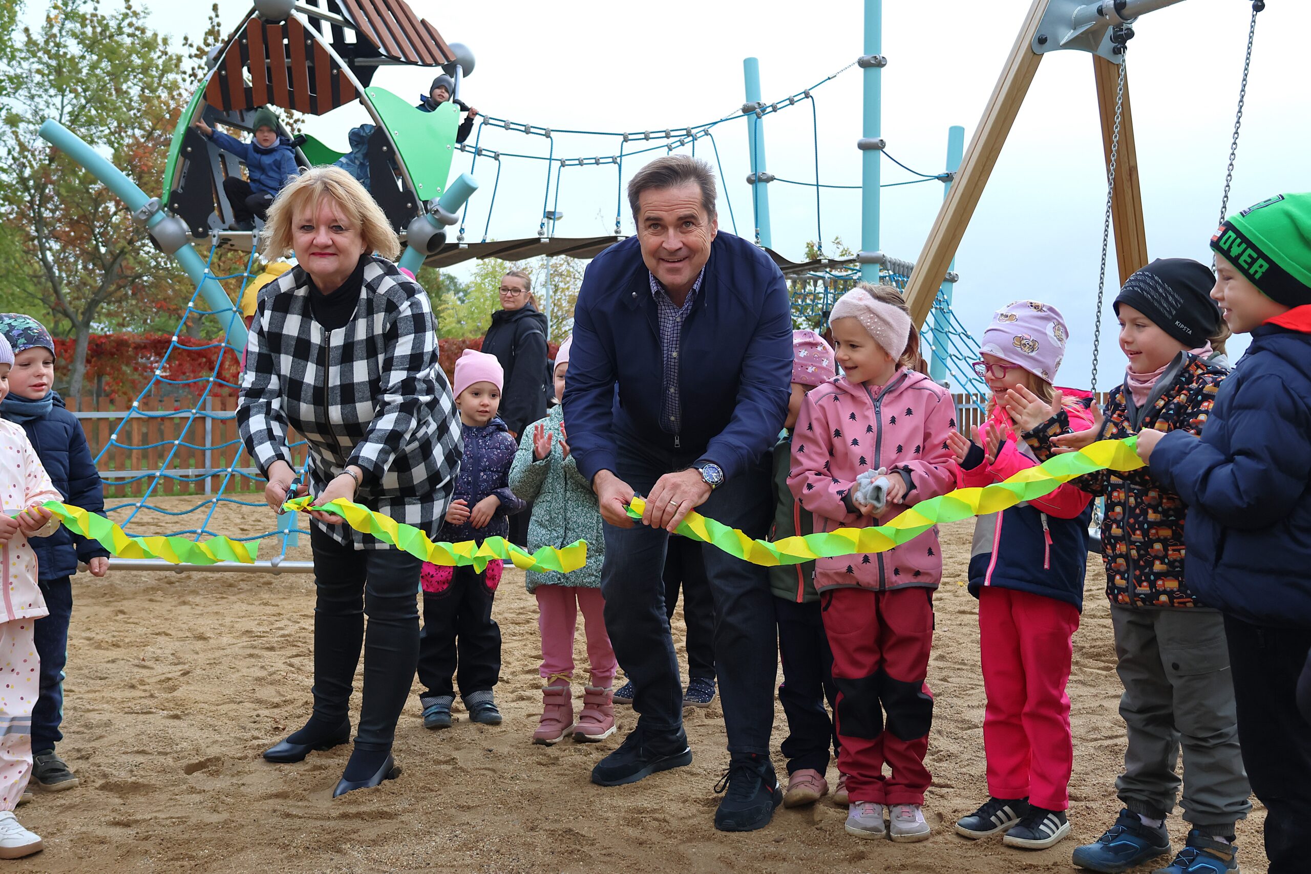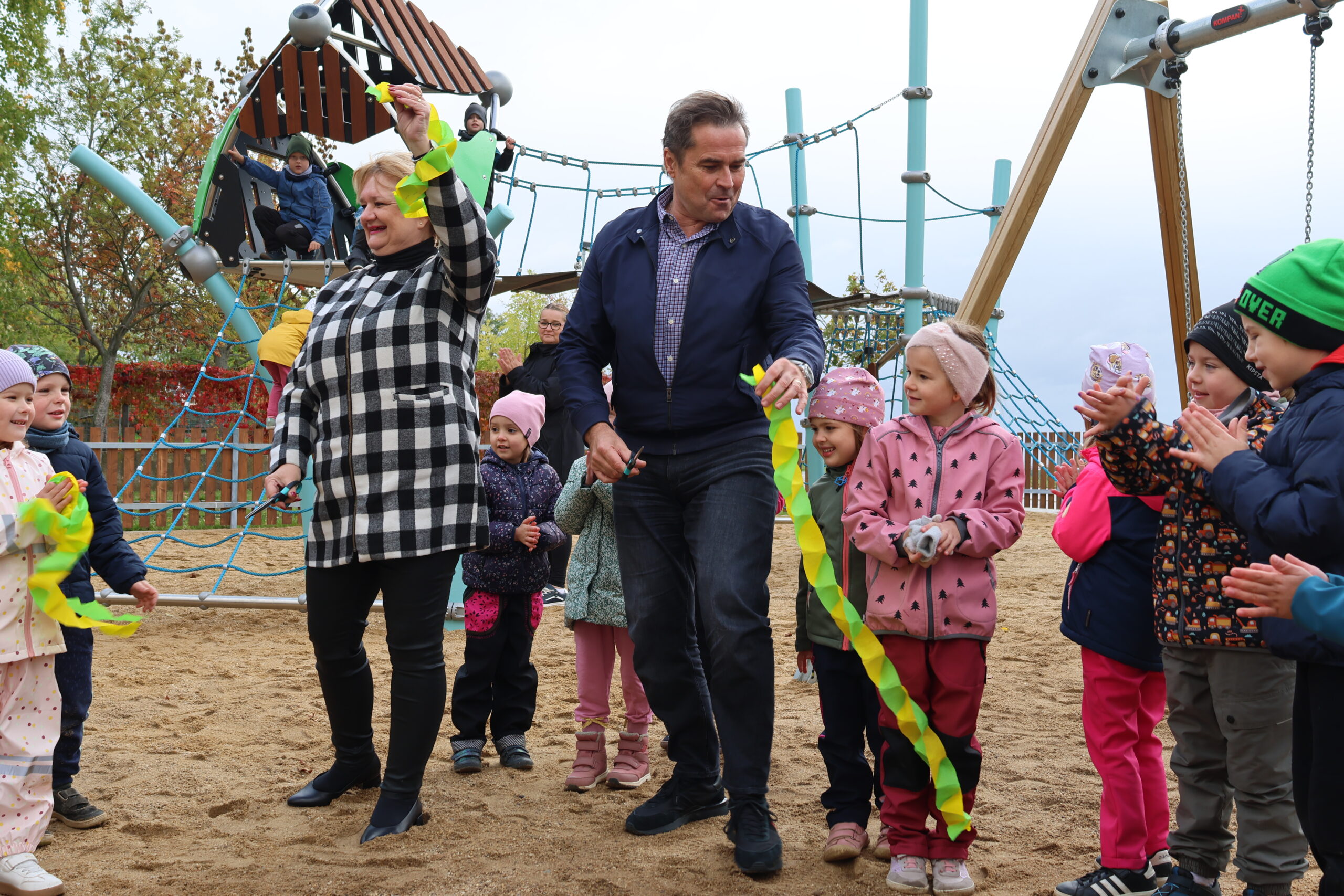 Starosta Prahy 13 David Vodrážka s místostarostkou Marcelou Plesníkovou společně s dětmi otevřeli nově zrekonstruované dětské hřiště v Husníkově ulici ve Stodůlkách.