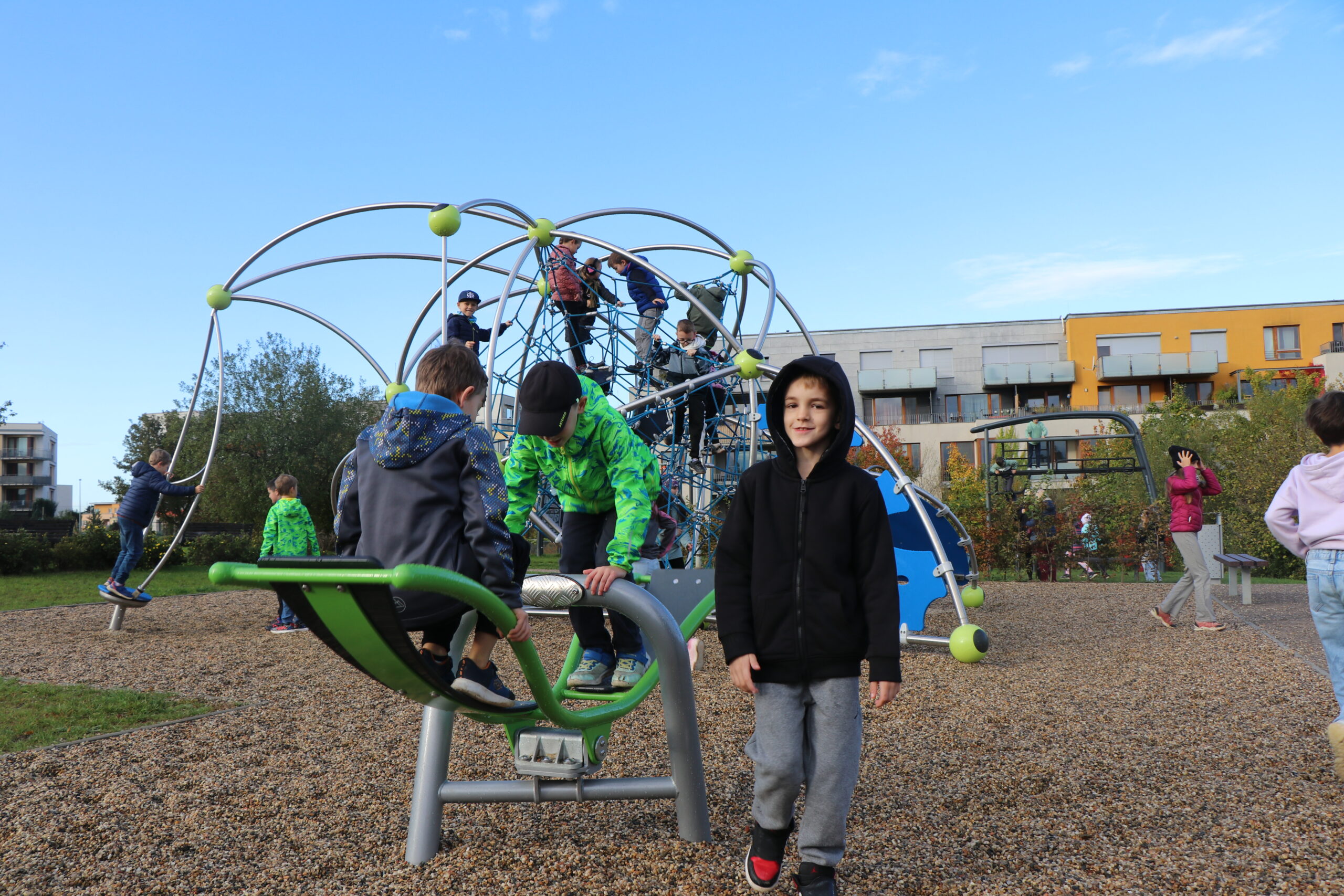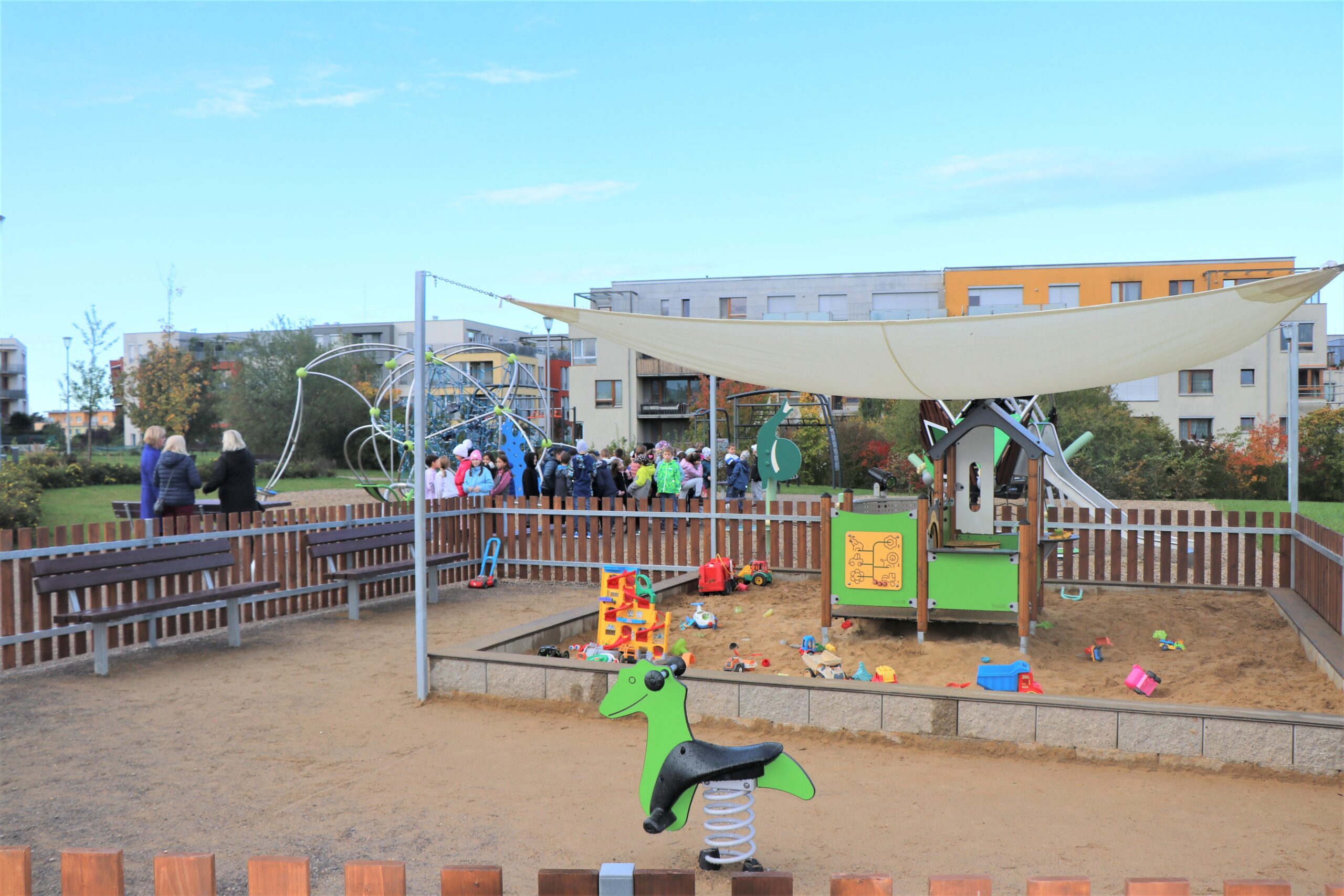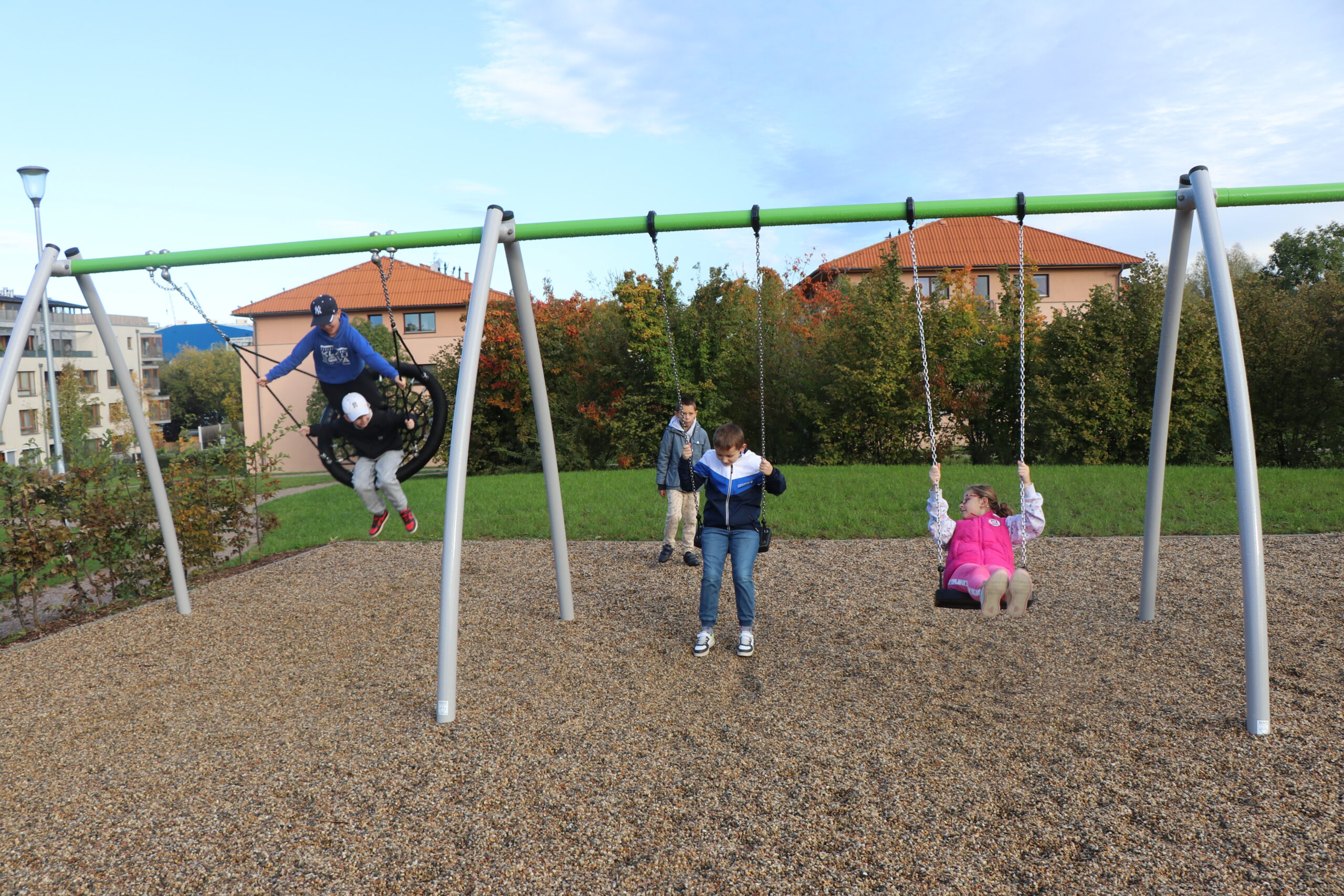 Plocha rozlehlého hřiště byla vybavena kvalitním bezpečným povrchem, který zároveň odvádí vodu zpět do přírody. Multifunkční prolézačky, houpačky, kolotoč i oplocené pískoviště doplňuje praktický městský mobiliář. Vedle laviček v areálu najdeme také stůl s lavicemi, který mohou rodiny využít k hraní deskových her nebo k pikniku, a nechybí ani stojan na kola.