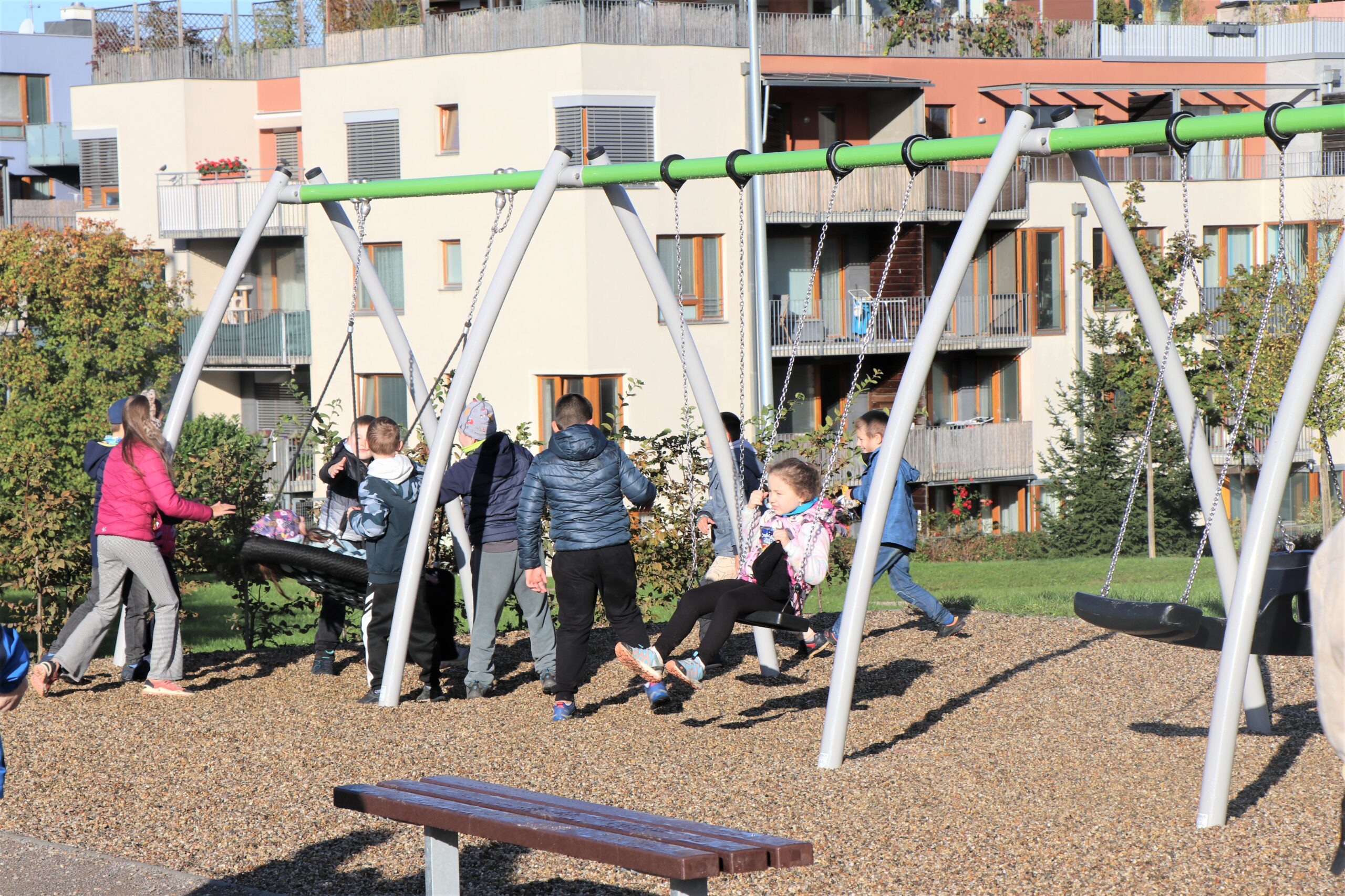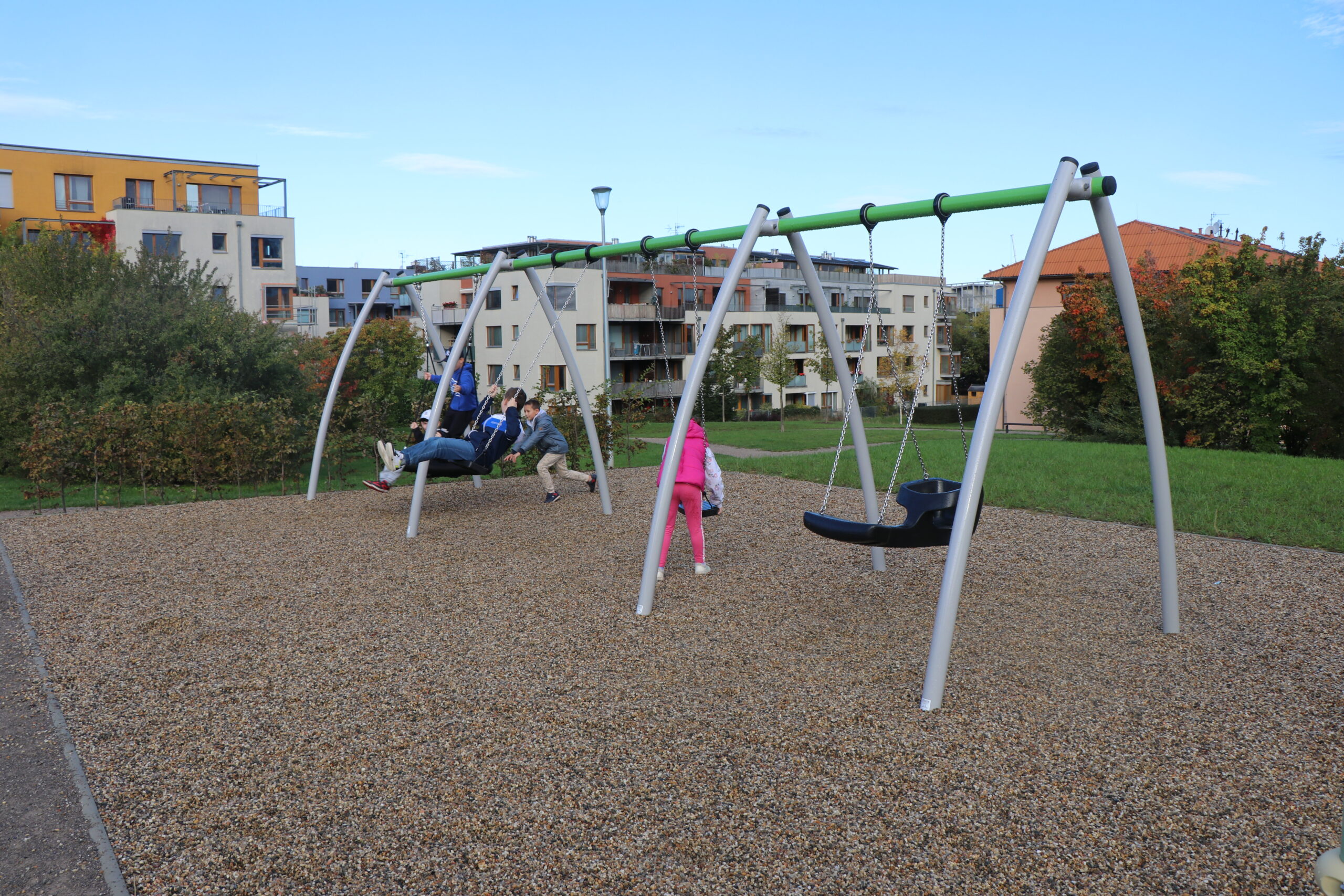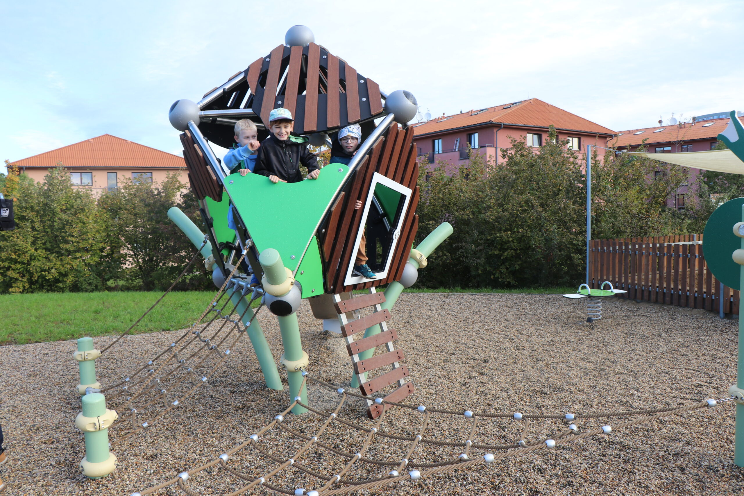 Plocha rozlehlého hřiště byla vybavena kvalitním bezpečným povrchem, který zároveň odvádí vodu zpět do přírody. Multifunkční prolézačky, houpačky, kolotoč i oplocené pískoviště doplňuje praktický městský mobiliář. Vedle laviček v areálu najdeme také stůl s lavicemi, který mohou rodiny využít k hraní deskových her nebo k pikniku, a nechybí ani stojan na kola.