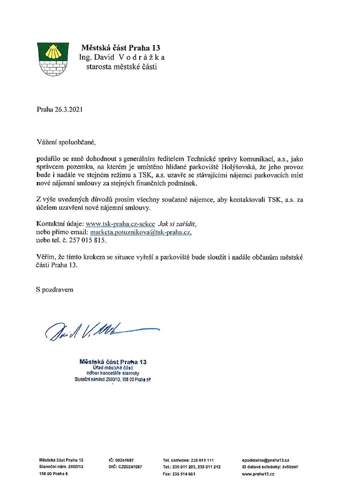 Stávající nájemníci získají nové parkovací smlouvy za stejných finančních podmínek. Prosíme všechny současné nájemce, aby kontaktovali TSK, a.s.
