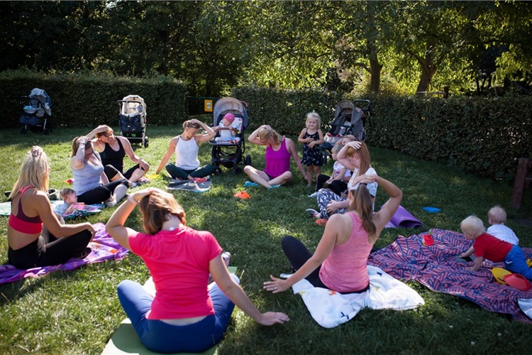 těhotné, Pilates, venkovní cvičení v parku, funkční cvičení.