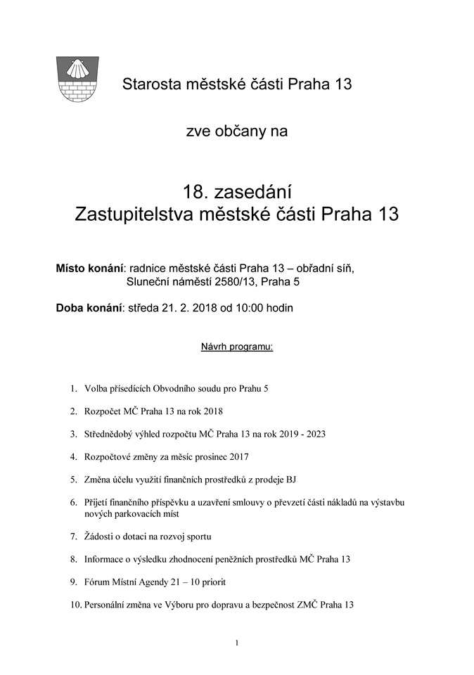 Pozvánka na 18. zasedání Zastupitelstva městské části Praha 13
