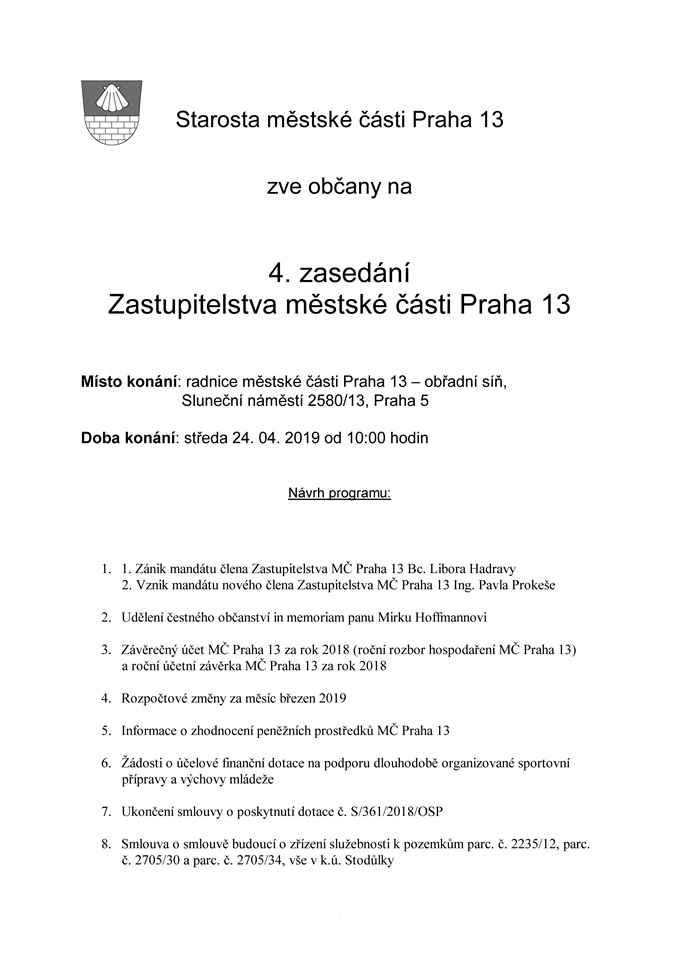 Ve středu 24. dubna 2019 od 10.00 v obřadní síni radnice MČ Praha 13