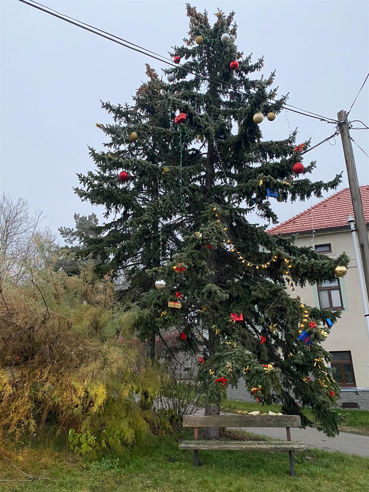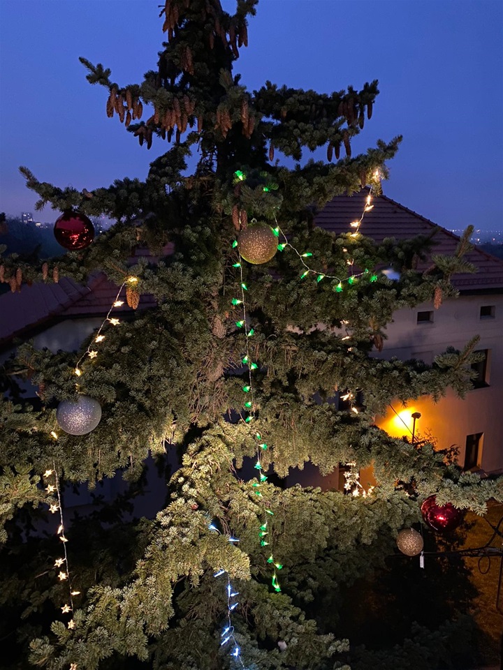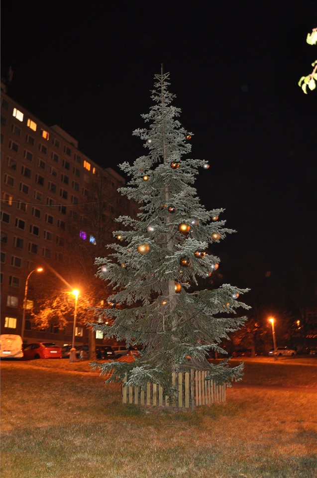 blízkosti stanice metra Stodůlky. Vánoční strom je ozdoben také u kapličky