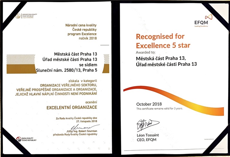 Praha 13 získala nejvyšší ocenění v Národní ceně kvality s označením