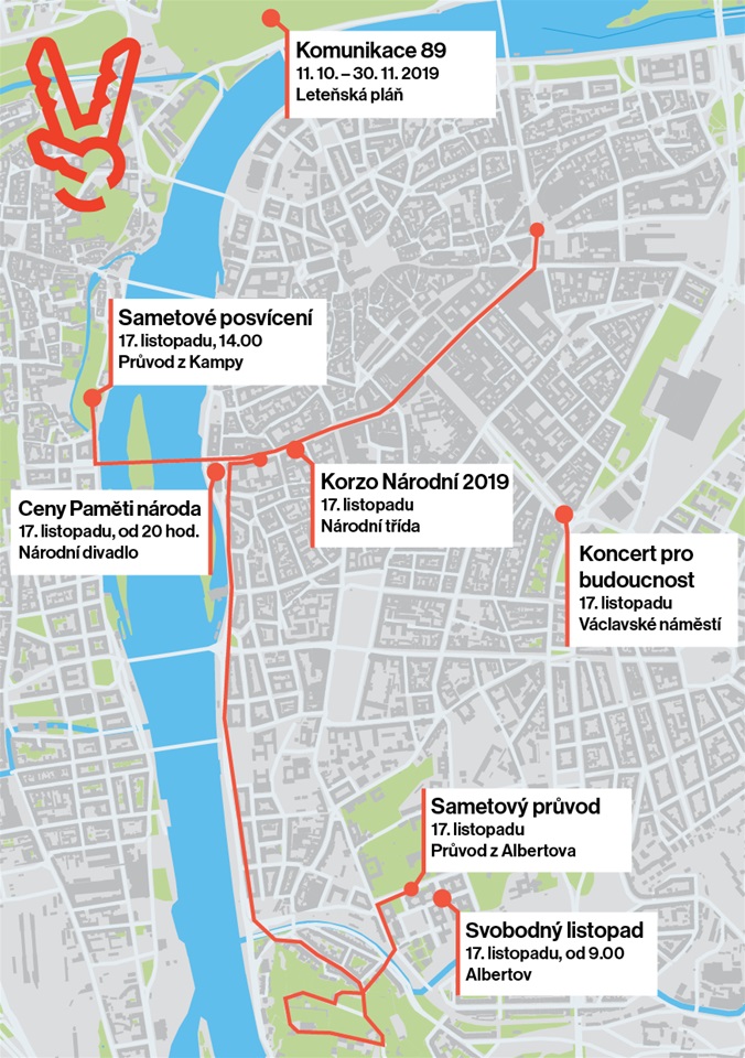 průvod, který bude kopírovat trasu průvodu z listopadu 1989, dobovou atmosféru
