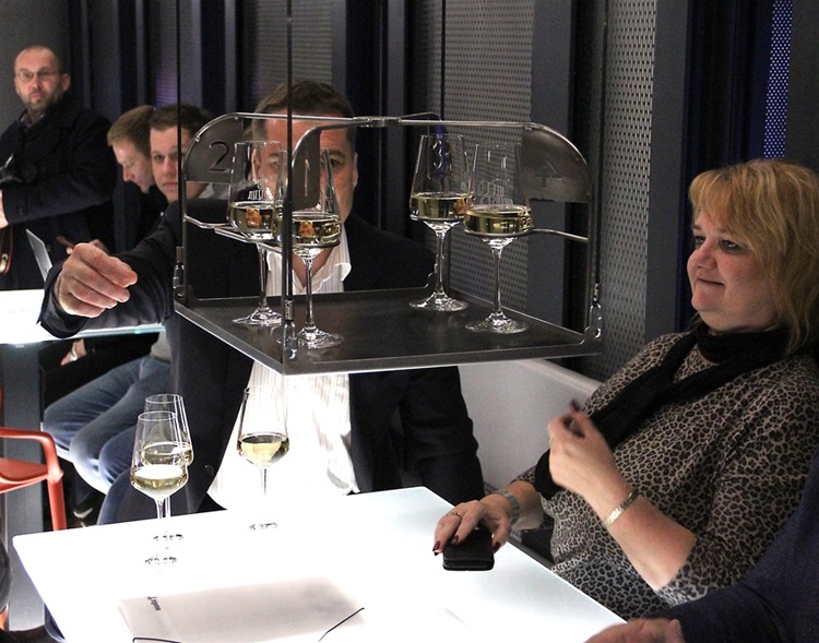 rozlévá přímo robot od Kuka Robotics. Vozíková dráha rozváží objednané víno a