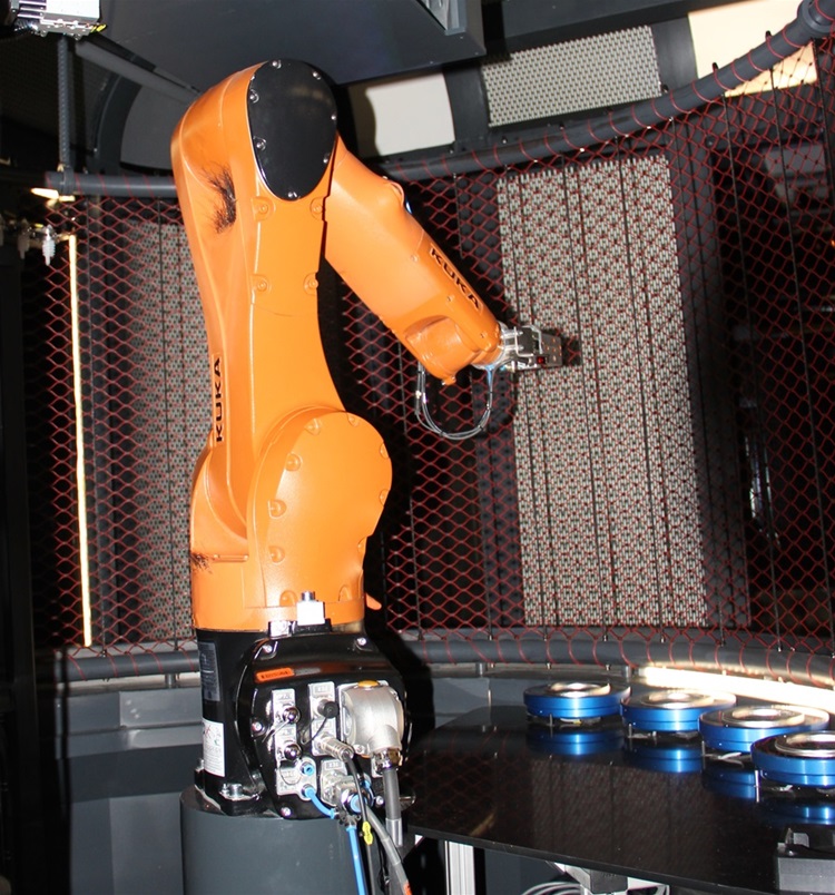 robotického pracoviště a vozíkové dráhy. Robotická ruka je v přízemí.
